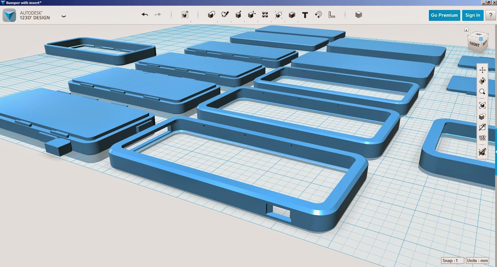 Also, I’m finding it’s ability to cleanly subtract one solid from another very useful, as in my approach to drawing up a phone bumper in which I drew the phone and it’s buttons, extending buttons where I wanted them pushing through the bumper, then subtracting the modified phone object from a solid block to reveal a snugly fitting bumper. Adding bevels or rounded edges is a breeze.
