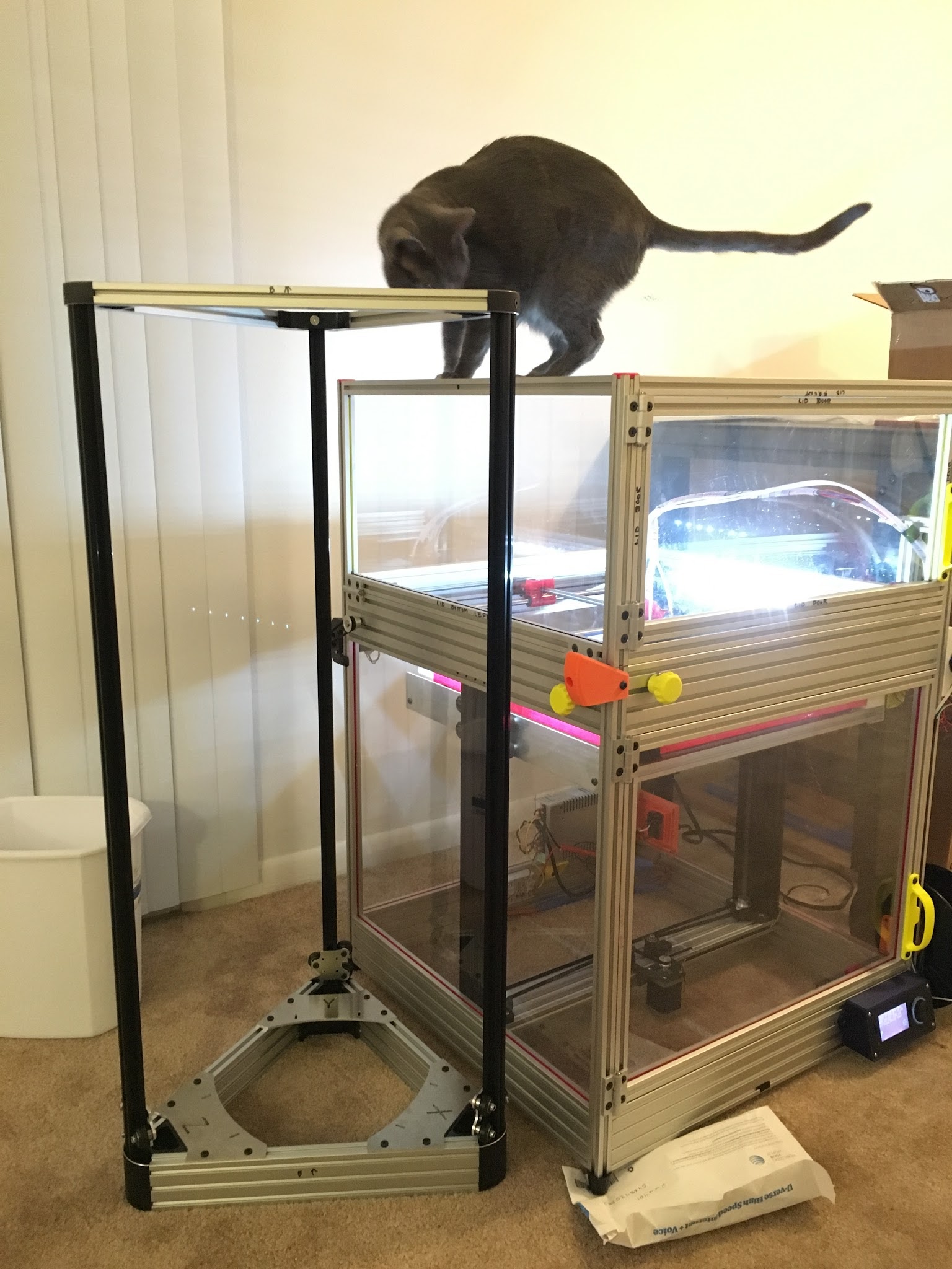 Just started building a Tria. Here it is next to my Herculien with a cat for scale. Apparently I don’t know how to build a regularly sized printer (I went with 1m vertical extrusions). One day…
