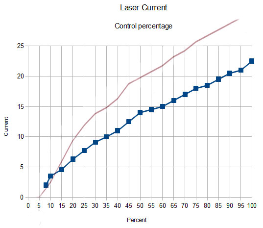 David Richards initially posted this, his power/percentage settings are in blue, mine are purple. He measured his at multiple points, whereas mine is through a single mA meter.