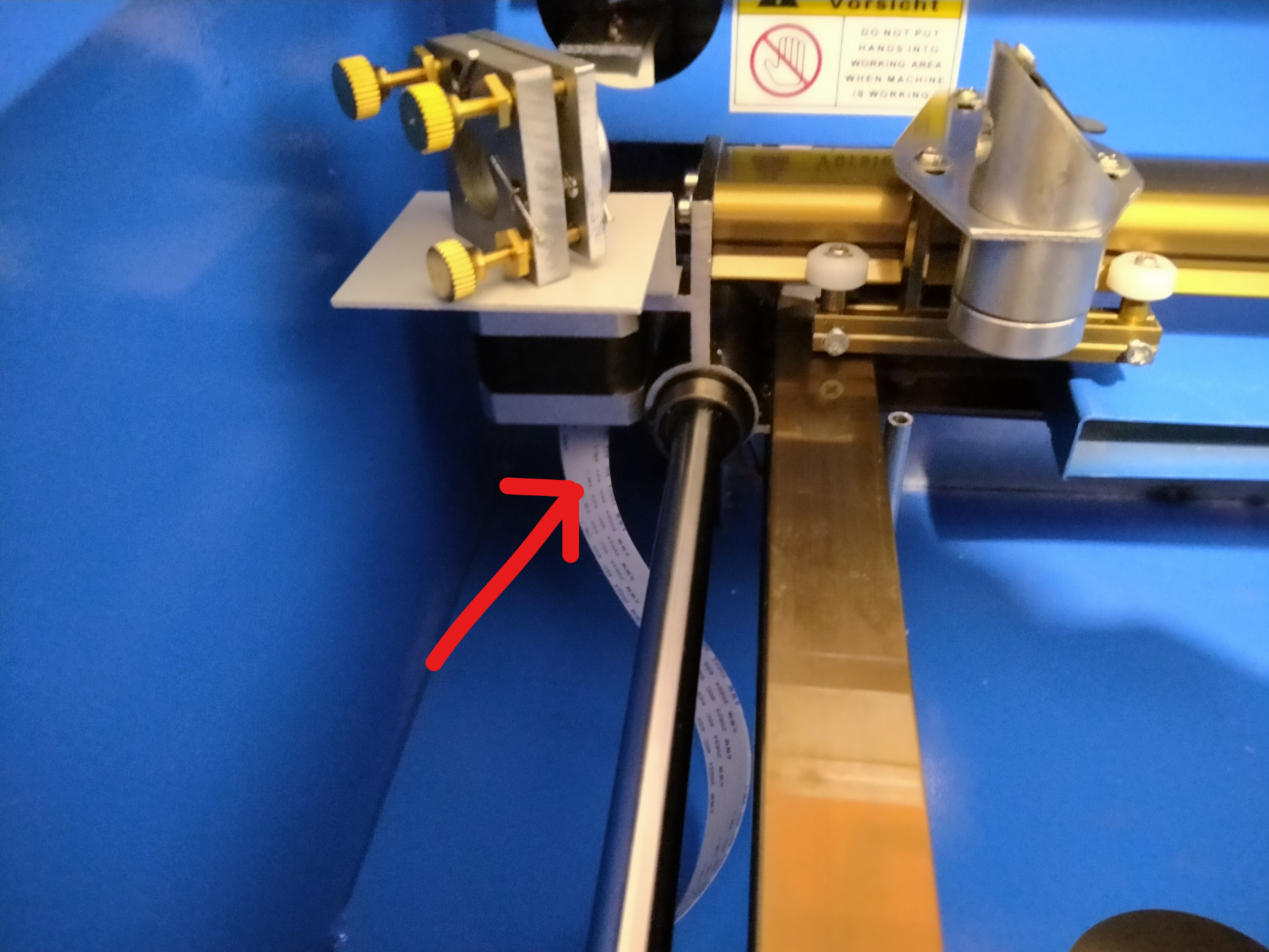 I have a brand new K40 that I am about to try and get going, and in mine the ribbon you have in your picture (with the red arrow) is just laying there, not hooked up! I was wondering what that was all about, now I am guessing it’s probably a problem…