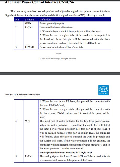L: PWM controlled by the Ruida during a job and when pushing the Pulse button. To test the L pins ability to fire the laser, tie IN to 5V and then briefly touch L to ground.