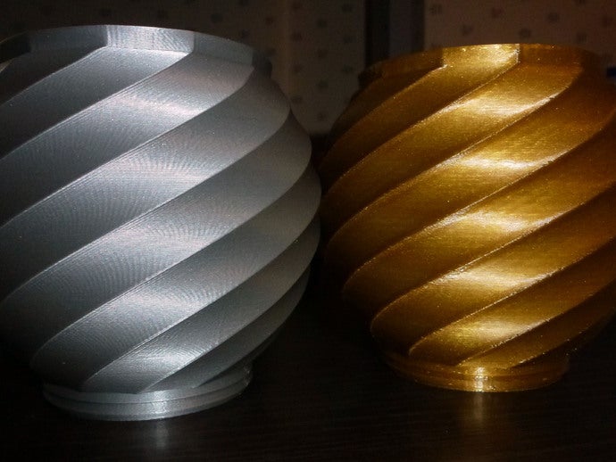 Latest iteration of the wife’s vase - printed in ColorFabb Silver PLA, .2mm layers on the Ordbot. It’s bizarre plastic - the moire pattern is from the camera, and I’ll be damned if I can take a photo without it!