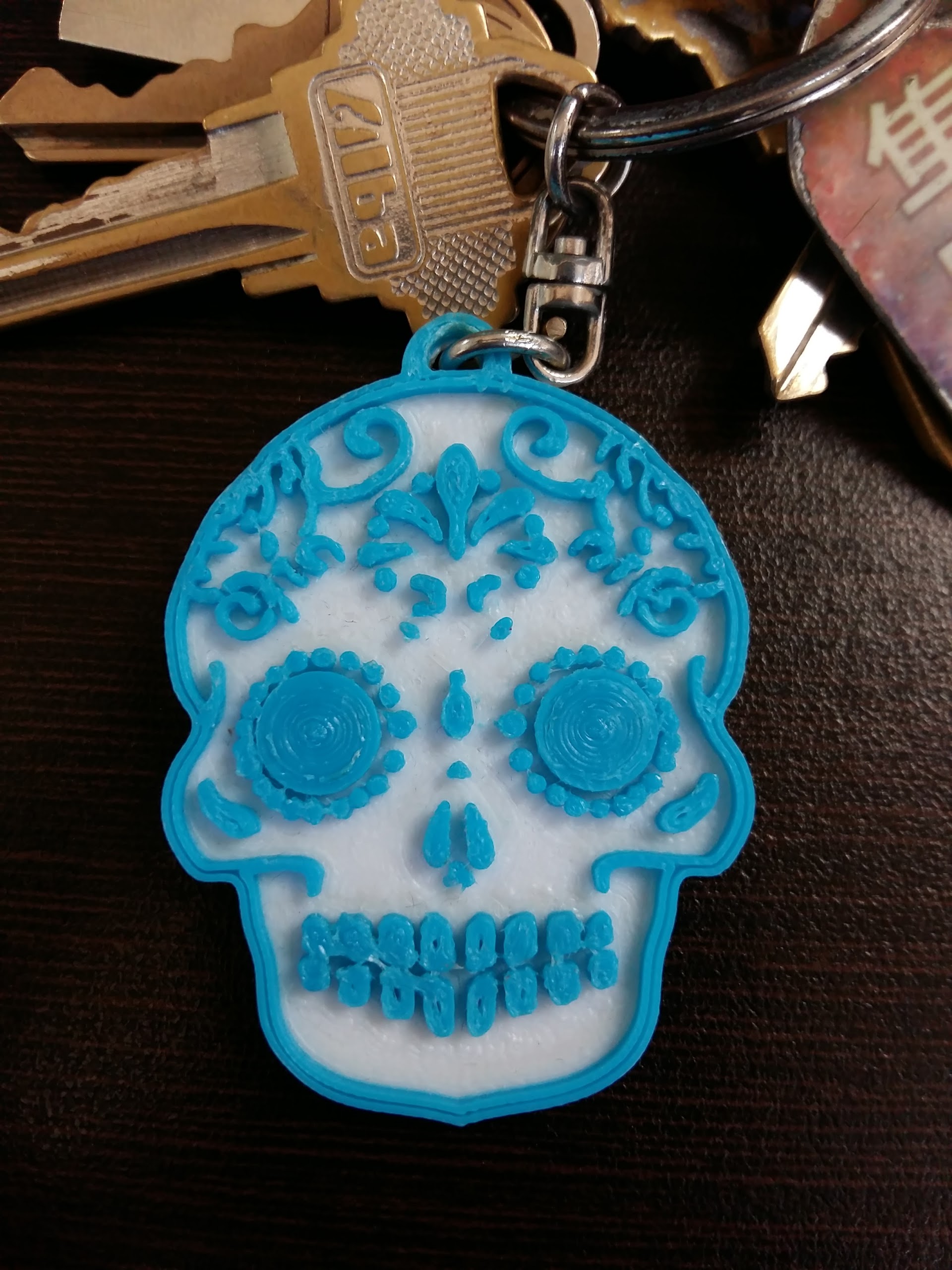 Llavero del Dia de muertos!!!, (Day of the dead keychain), not my desing, i found it on thingiverse just type skulls or mexican skull, printed on a craftbot 0.2 layer 100%infill, swaped fillament at the right height and voula, two colors print.
