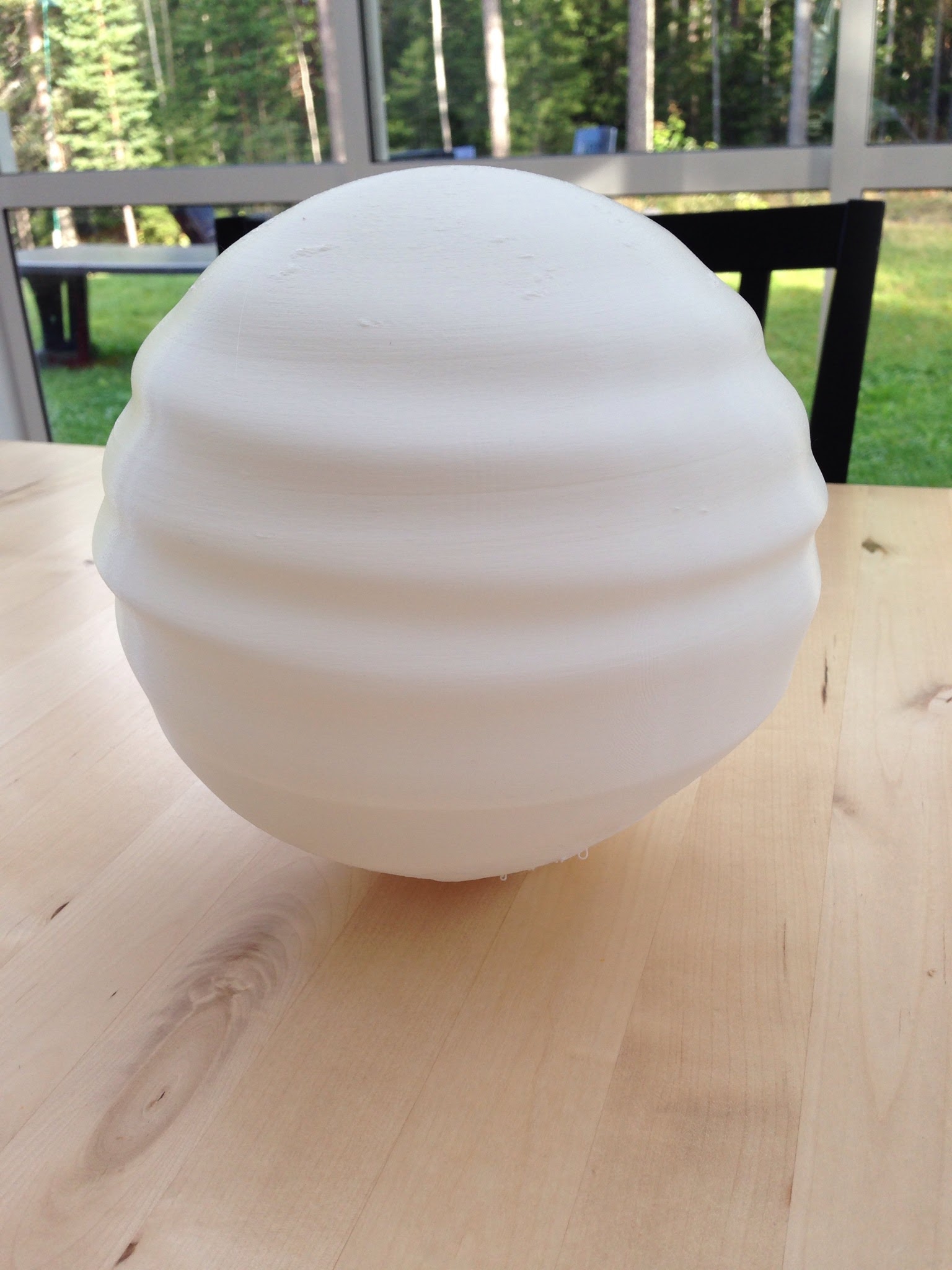 I’m trying to figure out how that could happen. Is it a single continuous spiral around the ball? It almost looks like massive Z wobble, but the Z screw would have to have about an 18mm lead for that to happen (Marlin source code suggests a 6mm lead, which is huge, but only about 1/3 what would be necessary to cause this). I’m thinking it must be the insufficient base area flexing and being dragged slightly by the nozzle (joris mode, right?) as it went in circles. As the base flexed, the side that was too high experienced more drag and the sphere was pushed in that direction, so the high point was in a slightly different point in the next layer, and so on. Amazing that it wasn’t enough to make the print fail completely…