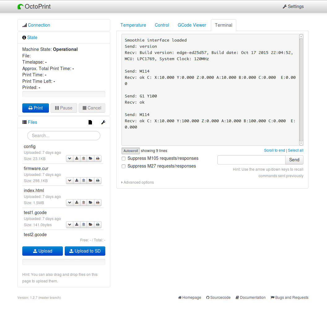 Right now I have it working fully without the octoprint server, just hosted on the SD card of a Smoothieboard, served by the Smoothie firmware’s web server, and it’s able to list the files, send commands, and receive answers.