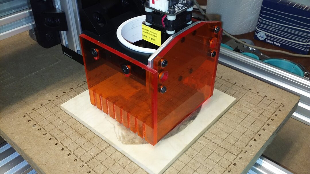 - The side frames are solid material (colored acrylic) the top is clear acrylic with a hinge and interlock switch. A shield above the laser module may be effective protection.