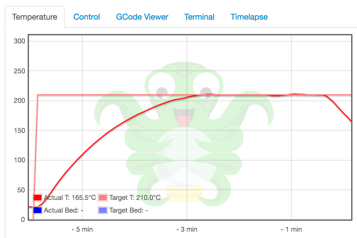 New Heater cartridge, reaches temp in under 3 minutes…Extrusion appears good and fine, no clogging. Tell it to print and 2 minutes in…heating just gives it up. (Fuse? The Printer has those Rumba bad-reputation Polyfuses)