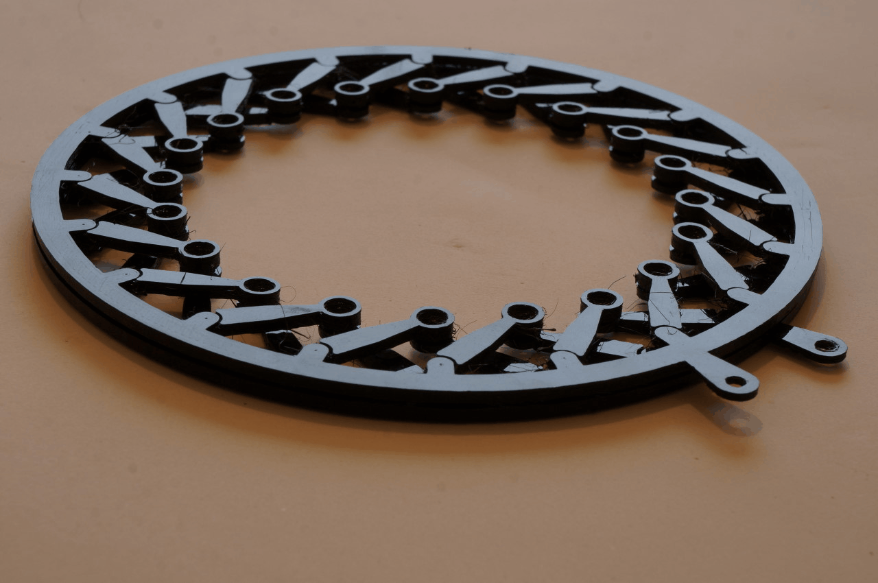 I 3D-printed this nozzle actuator for a fontaine, as 2 Parts only (upper-lower ring) – no further assembly (or cleaning), total of 60 hinges. The Hinges were moved once, before combining the rings, to ease them.