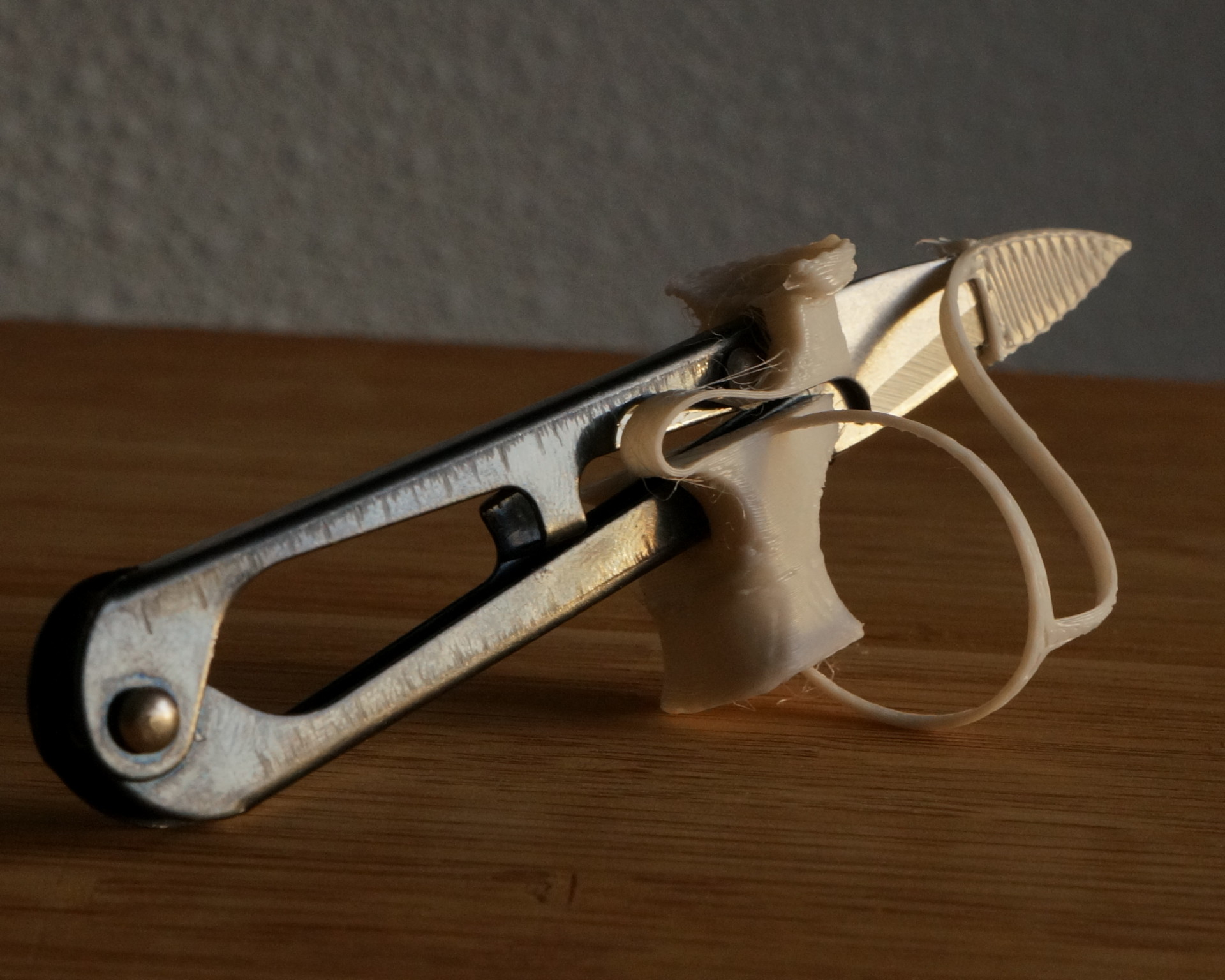 with FLEX filament you can really print 4D - so your 3D-prints folds into a final structure. The fingerloop, where the cap is also attached to, has at its end a small ball to stick in the hole at bottom.