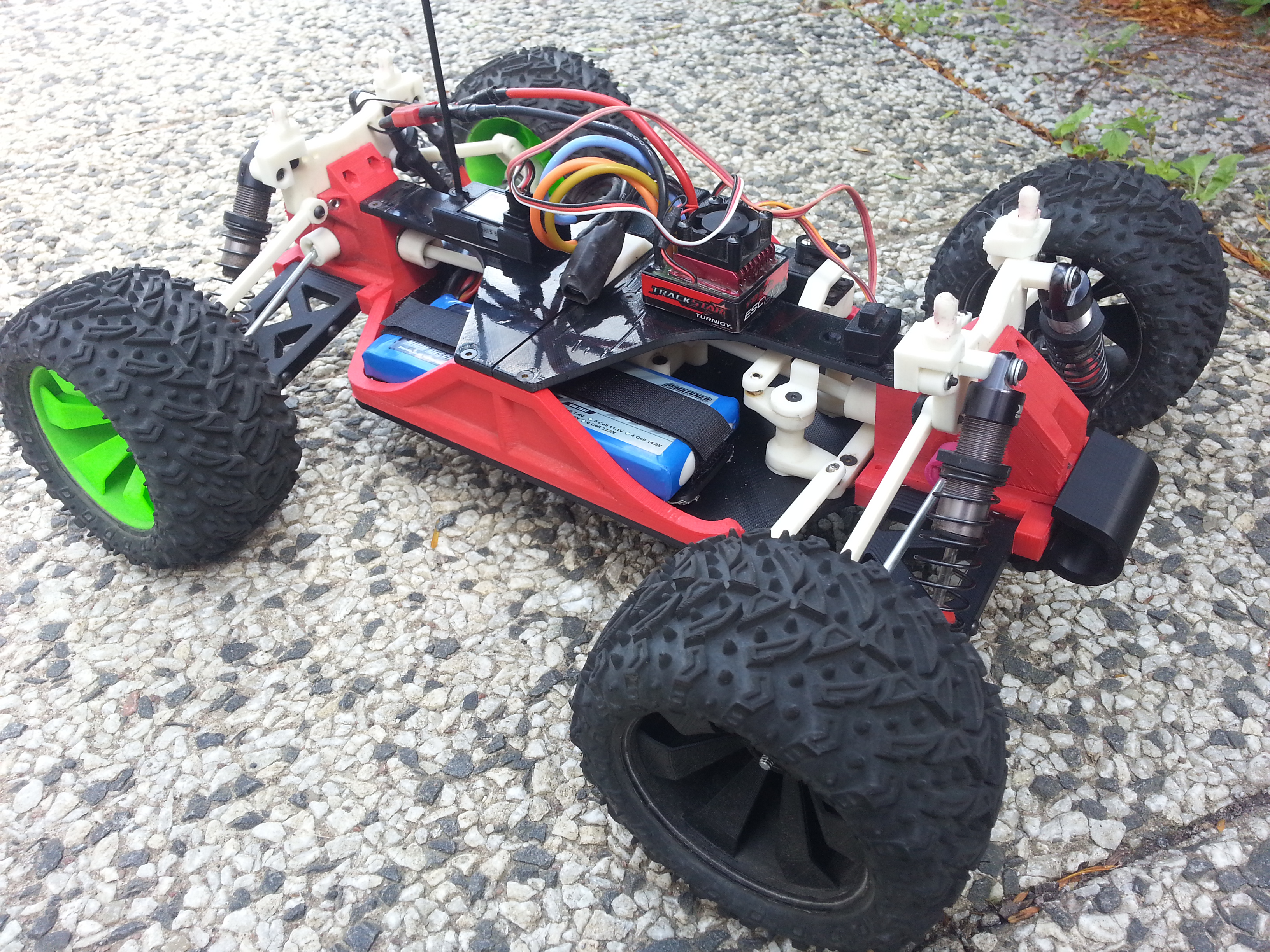 Modded chassieplate and top plate. New battery holder (and a cable bracket), new reciever holder and I’ve also done some modifications to the bumper which I hope will withstand impacts better now.