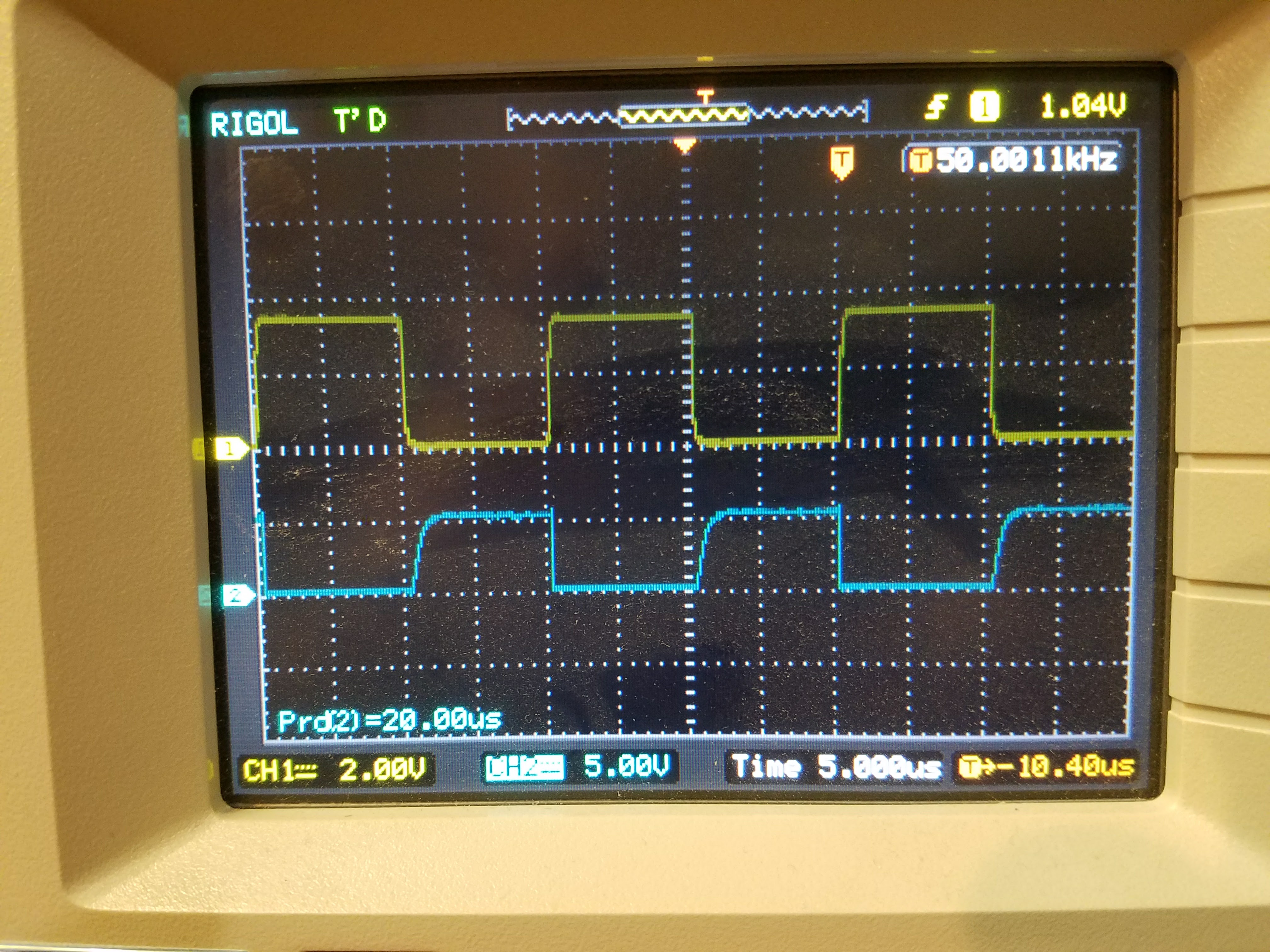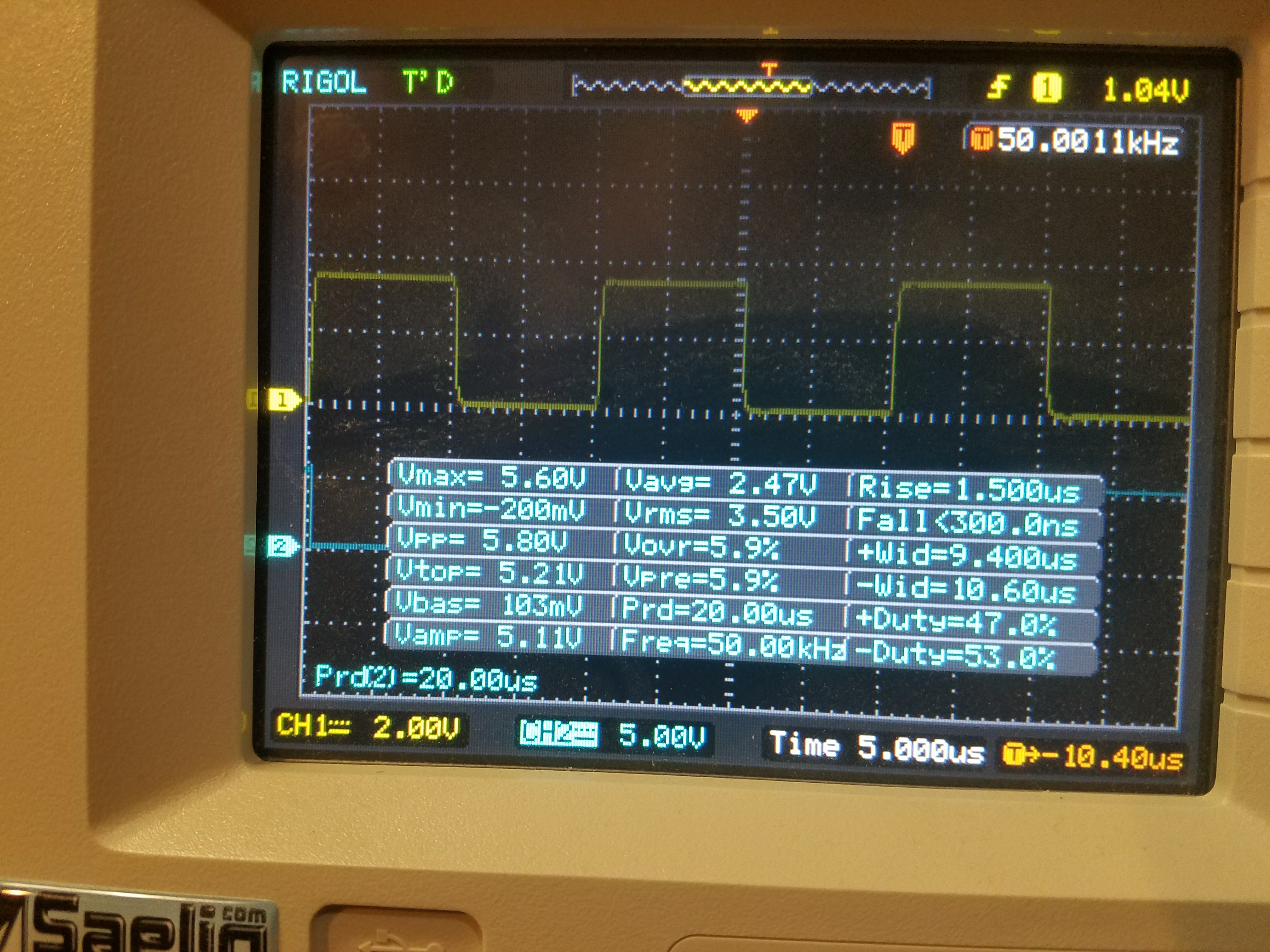 The scope channel 1 was connected to the P2.4 output of the processor.