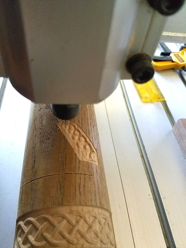 Moving into rotational axis, mapping 2.5D relief to oak cylinder from recycled lamp. Not true 3D because I’m using the X axis as if it was flat and limited to the diameter of 119mm. It’s a trivial way to get 3D objects without full 3d models and it has a long history in art. Reliefs are a major part of the story of the development of linear perspective and mapping textures to surfaces is not just for gaming any more.