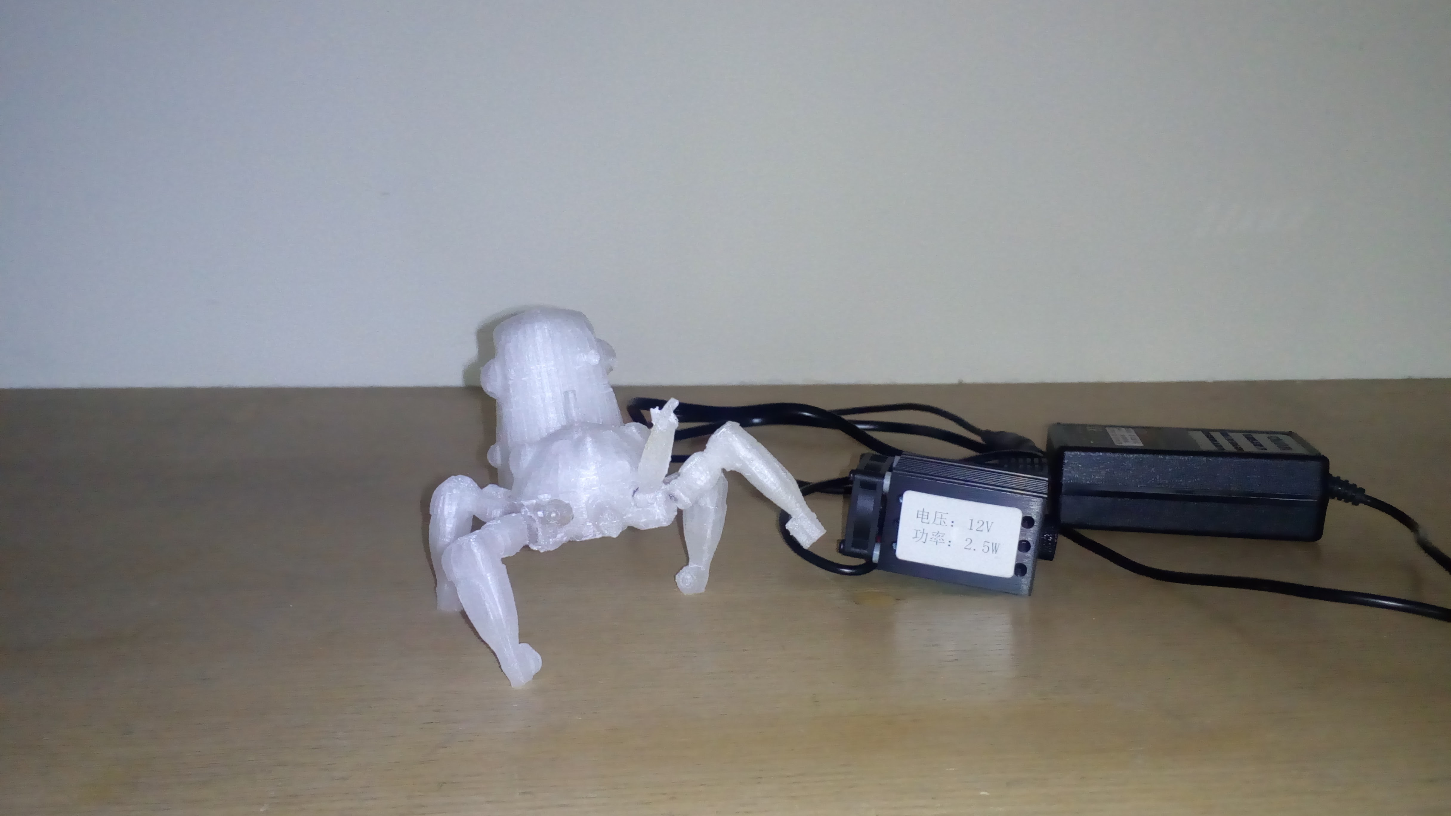 My first complex print. It took all evening and all night. Poor thing had it’s legs and arms came off while I was cleaning it up after printing it. I welded them back with a laser. ABS let’s laser light through so I painted small black dots with black marker and heated them up from outside with laser.