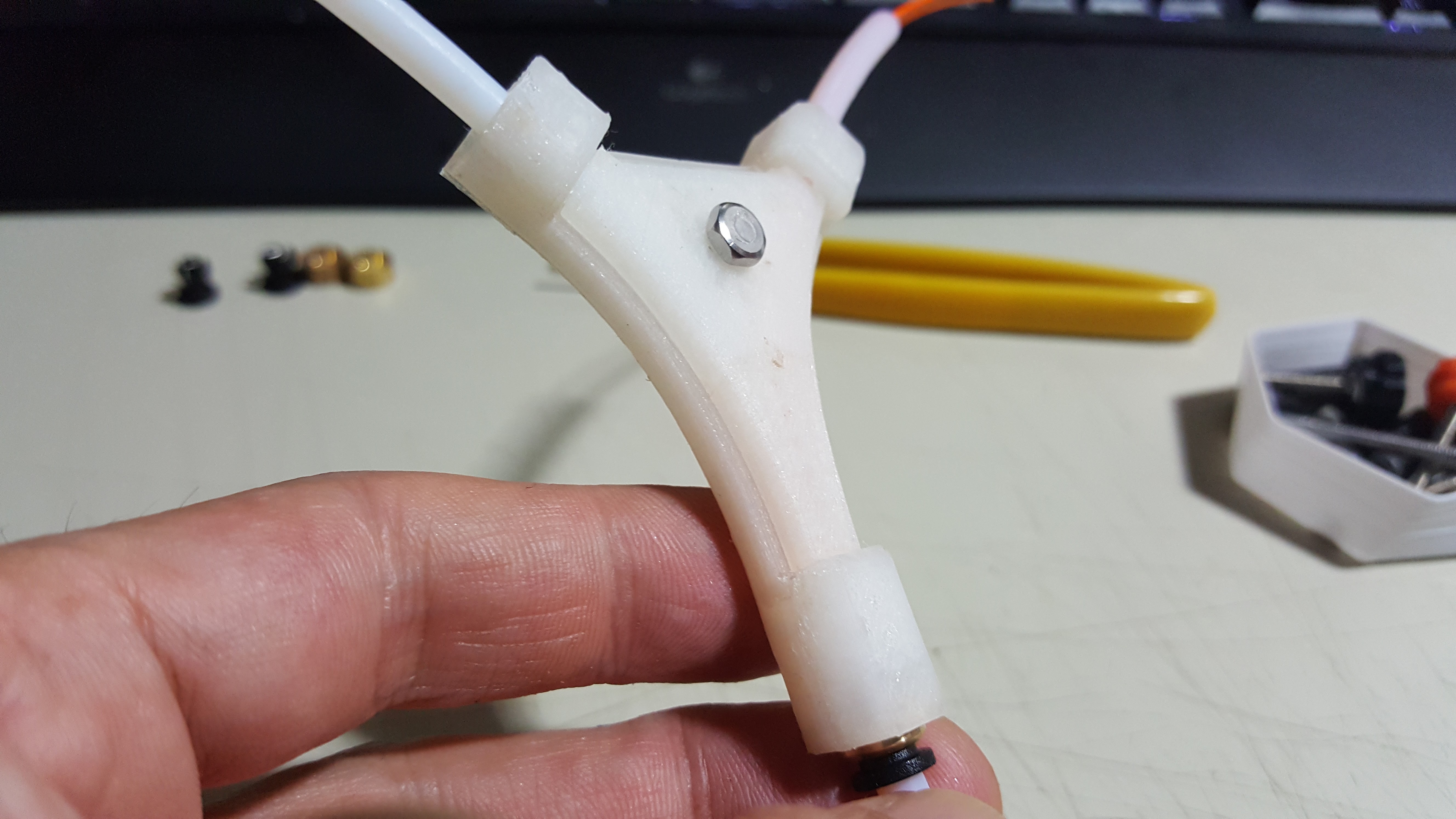 I suspect a very short section of aluminum will be enough to remove any remaining heat from a blob and force it small enough it won’t block the splitter. Hopefully just a 2-3mm disk with a hole. I want as much PTFE tubing in the splitter as possible and it’s either lengthen the splitter, which affects the bowden length, or loose a little of the PTFE insert on the hotend side, of which there is only around 8mm as it is.