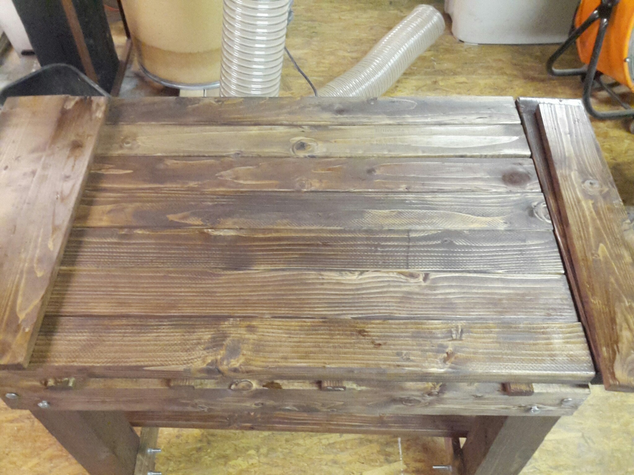 Decided that since our rigidbot was coming soon, that i needed to start getting things together and make a table. so I woke up Saturday morning and drove to the hardware store and sat in the car park and did a quick sketch of my table . You will see the sketch in my photos. Once finished walked in the hardware store and bought all the wood and bolts I need, ( unfortunately just too much). Then starting to build it. below are some picture of the table with and without stain. My wife didnt like the look of the natural wood so I had to go back to the hardware a buy wood stain.