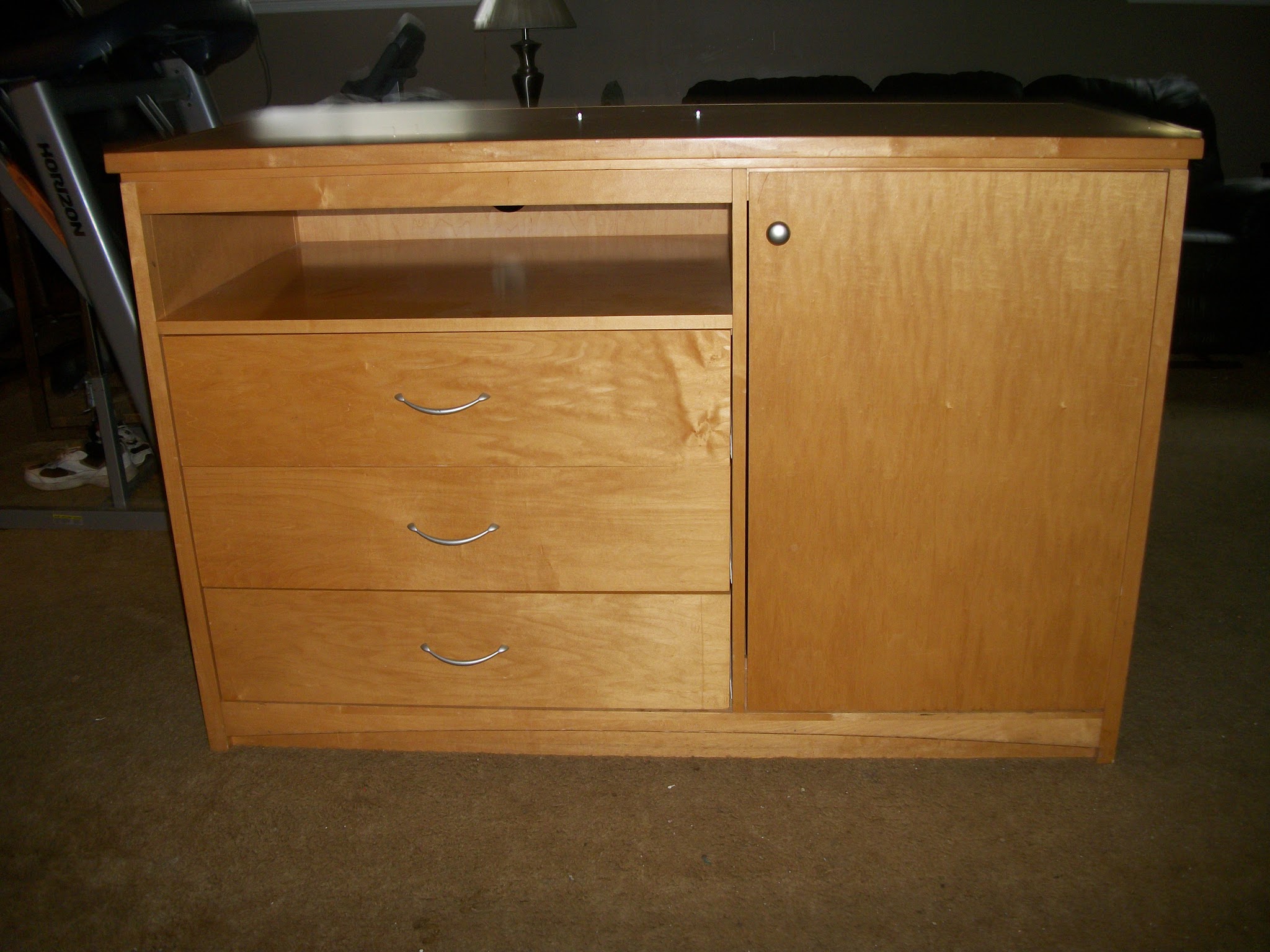 My new stand for my laser. Cooling water tank and pump, air assist compressor, and PC will be behind the door, the 3 drawers have plenty of room for raw materials. Size is 26" wide X 58" long X 38" tall. Picked it up for $100 at my local Habitat for Humanity Restore. Looks like it came out of a high school science lab.