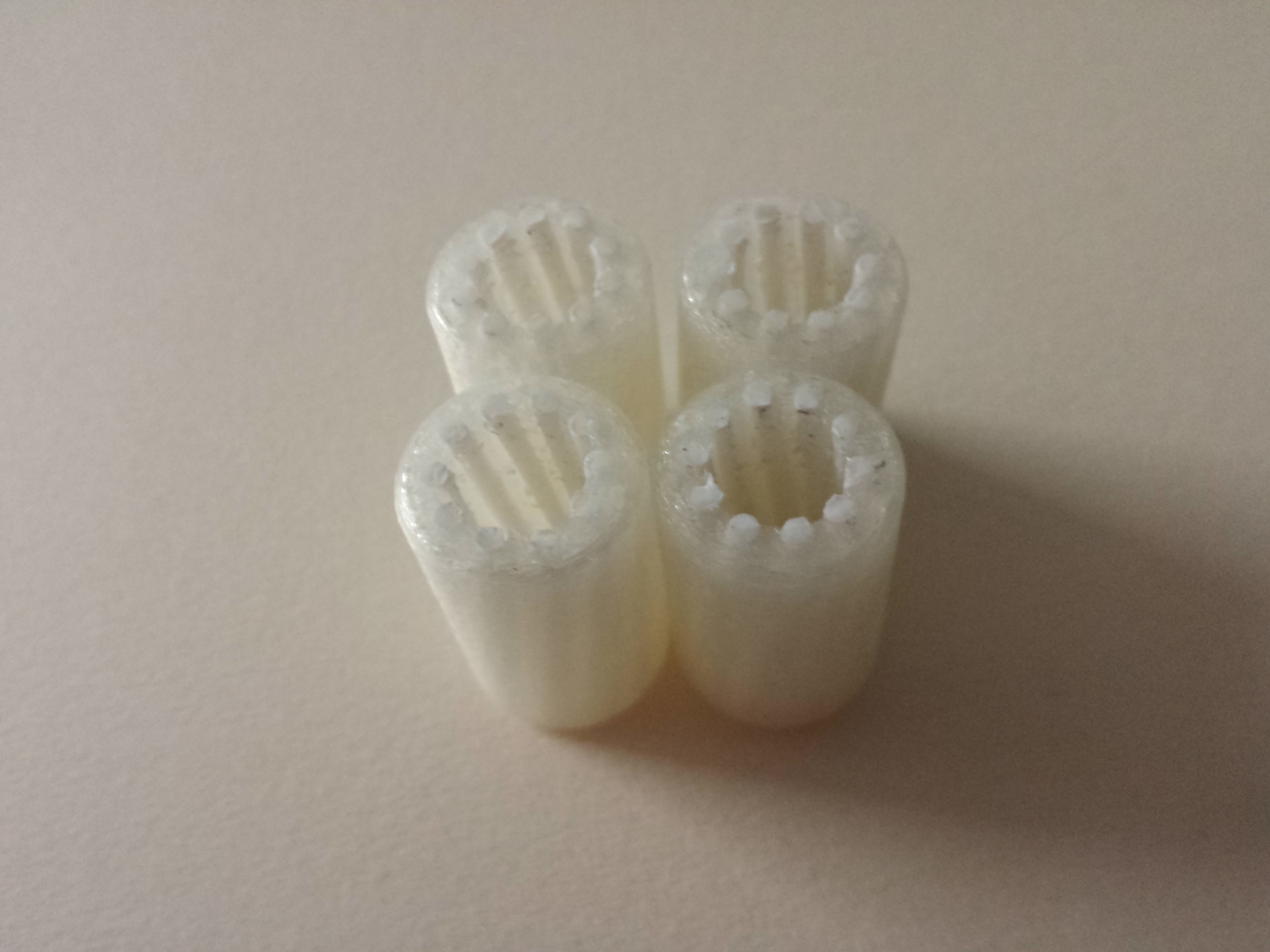 this is my attempt at creating printed bearings. http://www.thingiverse.com/thing:906972 my thinking was extended length to keep it stable but minimal contact surface to keep it moving consistently. They all have the same contact area. I should redo them to fit un extruded filament and test again,.