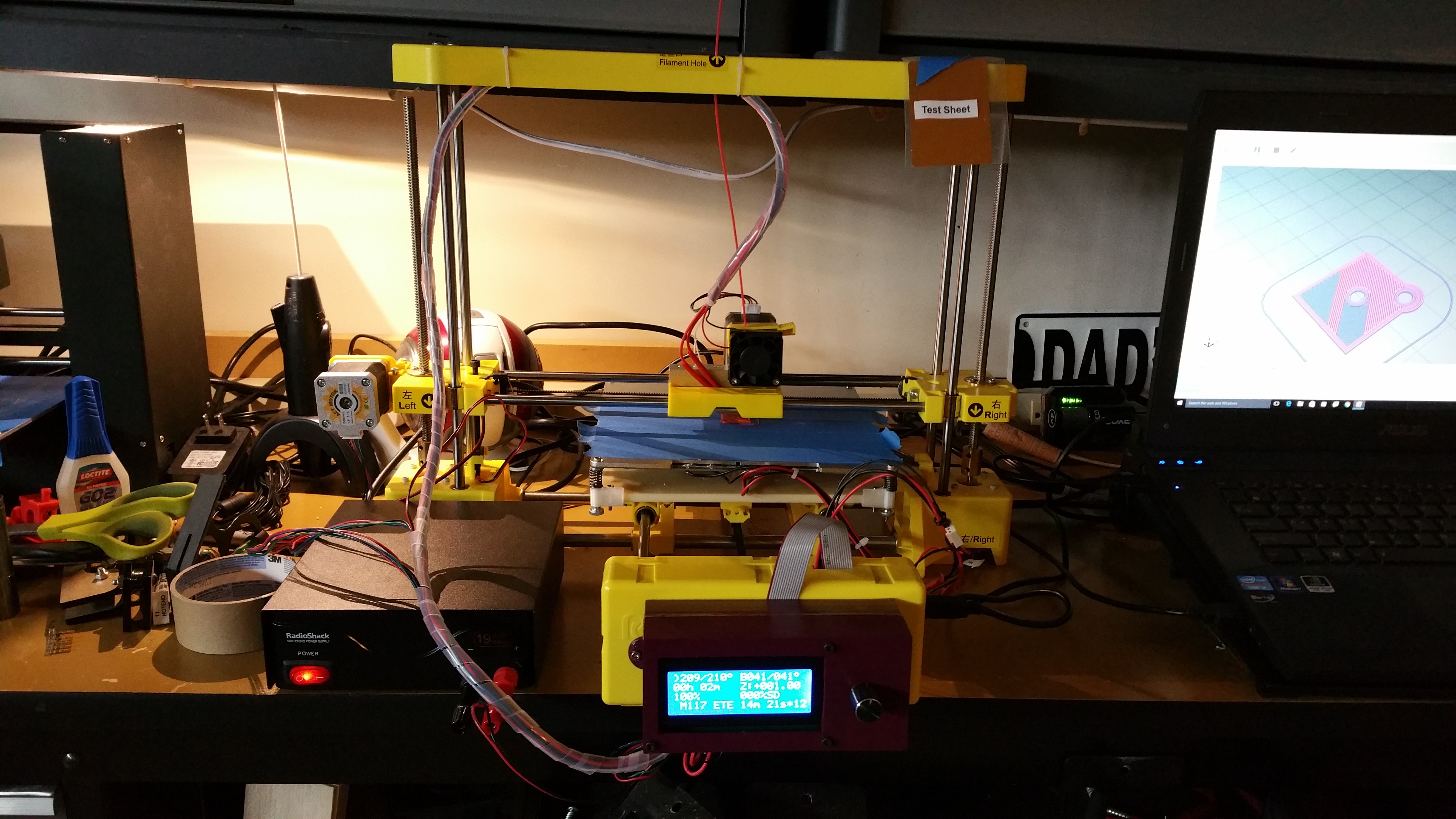 My PrintRite DIY printer modified yet again to use an all aluminum heatbed arrangement with an excellent benchtop power supply. The Thingiverse mod by brkdwn was extended to allow better handling of the bed corners. My supply puts out 14V at 19A. More than enough for the job. Works perfectly even though I lose about 15mm of Z.