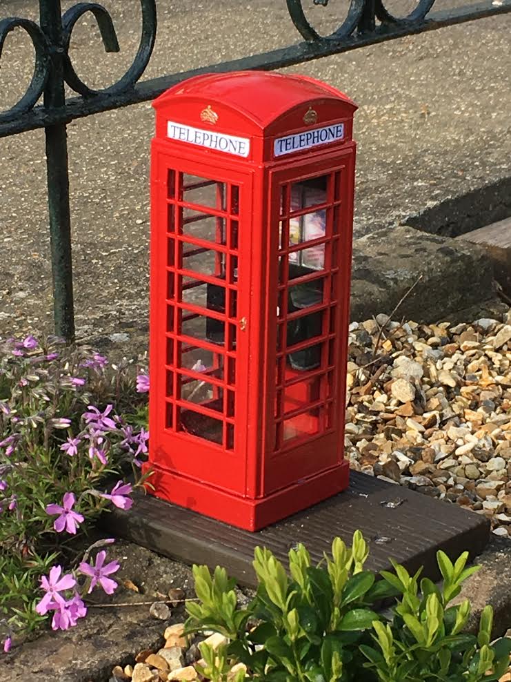 My scale (1/10th) model of a UK “K6” telephone box, painted and fitted at a local model village here in Dorset. The model includes the crown detail, the handle and the interior parts (printed in black). The “telephone” labels and interior posters were added by the staff, along with thin polycarbonate sheets to form the “glass” for the windows.
