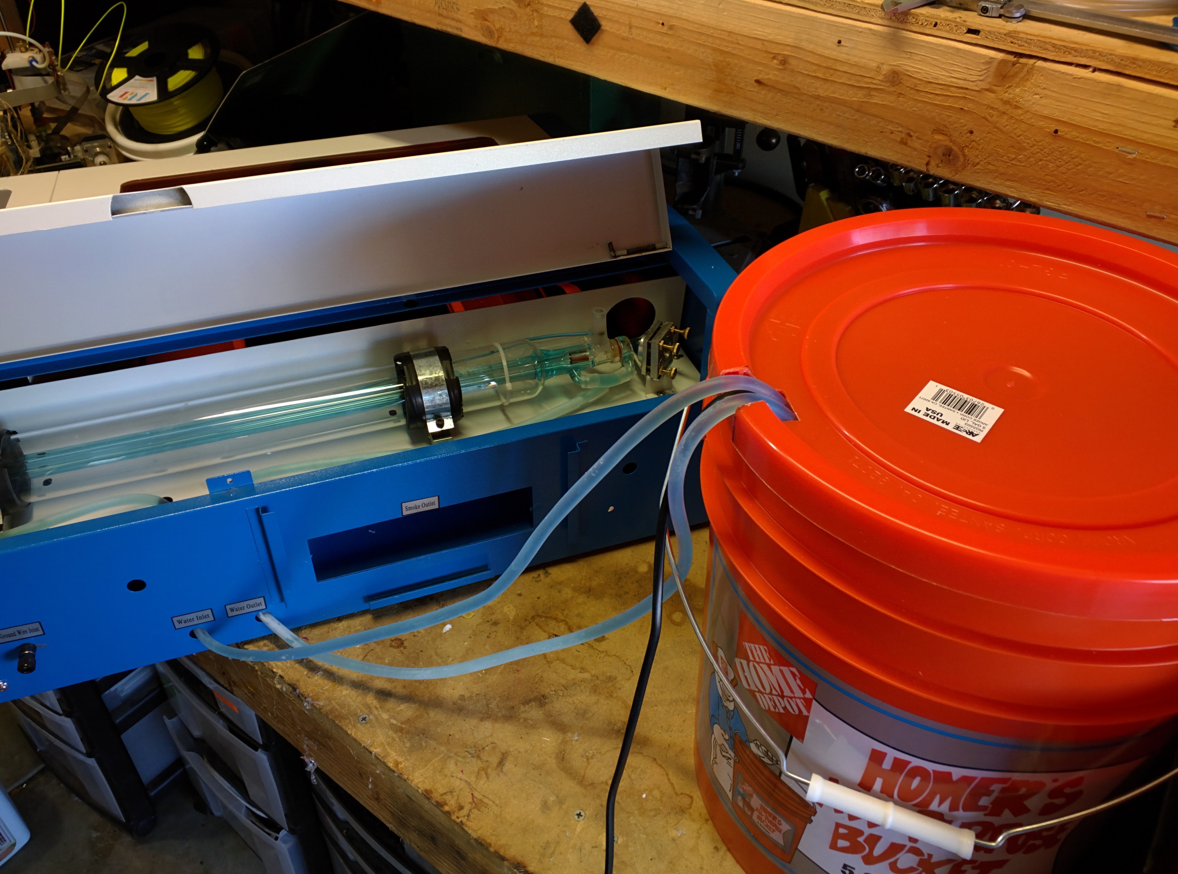 My simple water cooling system. Home Depot bucket. I added a little blue food coloring so i could see the volume in the laser tube and see the airbubbles easier. I added a cover to keep dust from entering the “tank”.