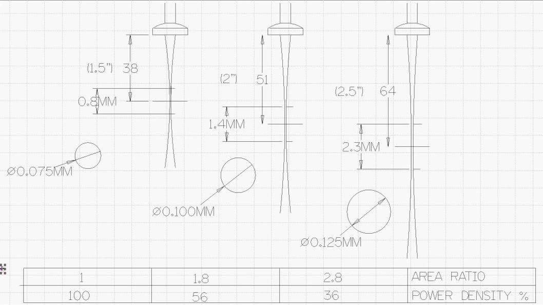 As the focal length gets longer, the minimum beam diameter increases but the ‘in focus’ zone gets longer too. This longer, more parallel cutting zone puts the entire thickness of the plywood in the sweet spot.