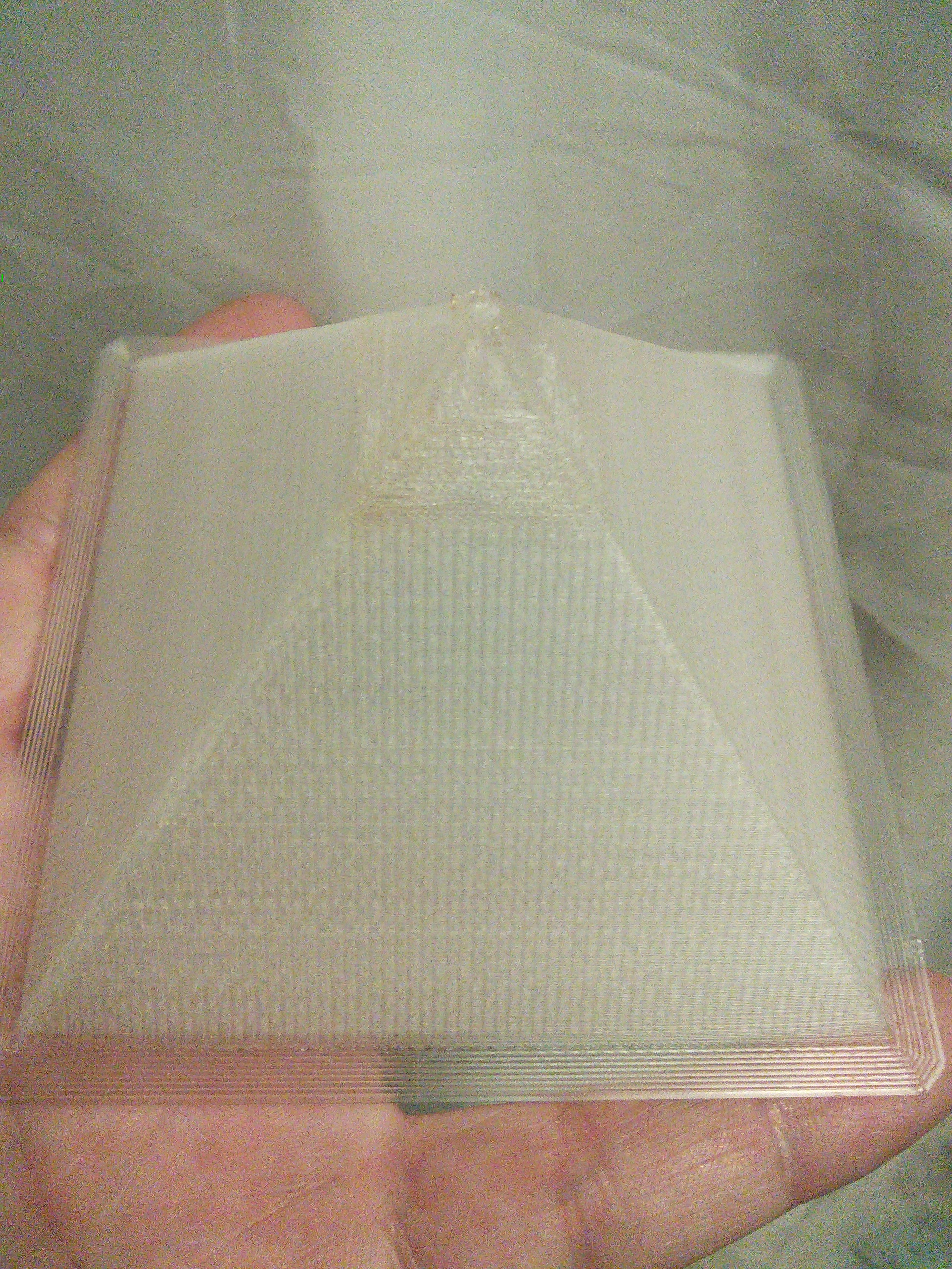 It’s printed in crystal abs at 250 C, the base of the pyramid is perfect, but the top part appears melted, it’s printed in a wallace based printer.