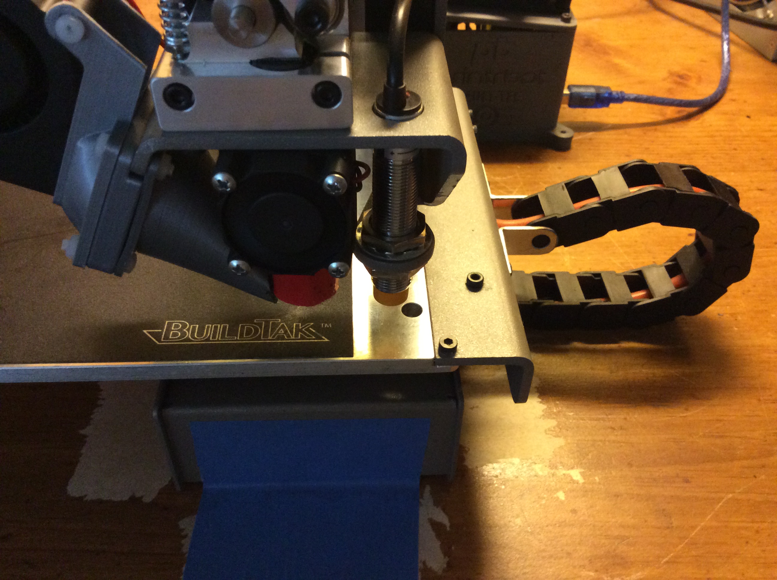 I have torn my Simple apart a number of times to check rods, the build plate, you name it. But recently I was watching my printer to ensure that all important first layer when I noticed something I will be fixing this week. I use BuildTak, and most of us have used the blue tape or some sort of masking bed prep to achieve adhesion and maintain our investment. Well it seems my print bed, and many I have spoken with report the same, is low on the home side (left) and high on the right side. Our printers use an inductive sensor to measure the z height, which is located to the right of the hot end and most of us only mask off the needed print area so as to not be wasteful with our materials. With the 3 point probe the first two points have that masking material below the inductance sensor. This bed prep material to an extent insulates the metal bed underneath it much like rubber insulates electricity in an appliances power cord, which causes the sensor to get closer to the prep material as the first to points are probed. The third and last point, as you can see in the photo, doesn’t have that insulating material blocking the sensor under it so it picks up the flux field at a higher height and adjusts the three point plane to seem as if it is skewed even though the print itself will be on top of the bed prep material and slightly higher than the point that isn’t covered and triggered the sensor more easily. The whole thing skews the entire print plane even though the bed may be flat, and the skewing is exaggerated by the thickness of the bed prep material plus the additional height that the uncovered probe point triggered higher at.