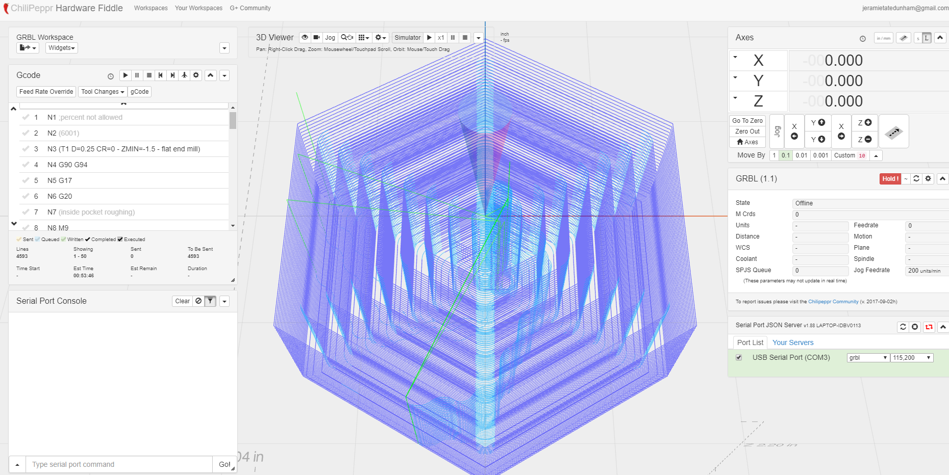 Need some help. looks like I connect when I am on the grbl work space but when I move to jpadie work space nothing comes across on my serial port console but I am connected to my serial port. I am running 1.1 on an xcarve. I was running yesterday with no issues.