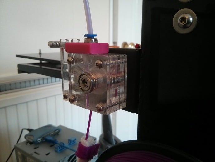 I didn’t get the full kit, so had to design my own extruder block to use a standard stepper motor. This one is laser cut and seems to work well.