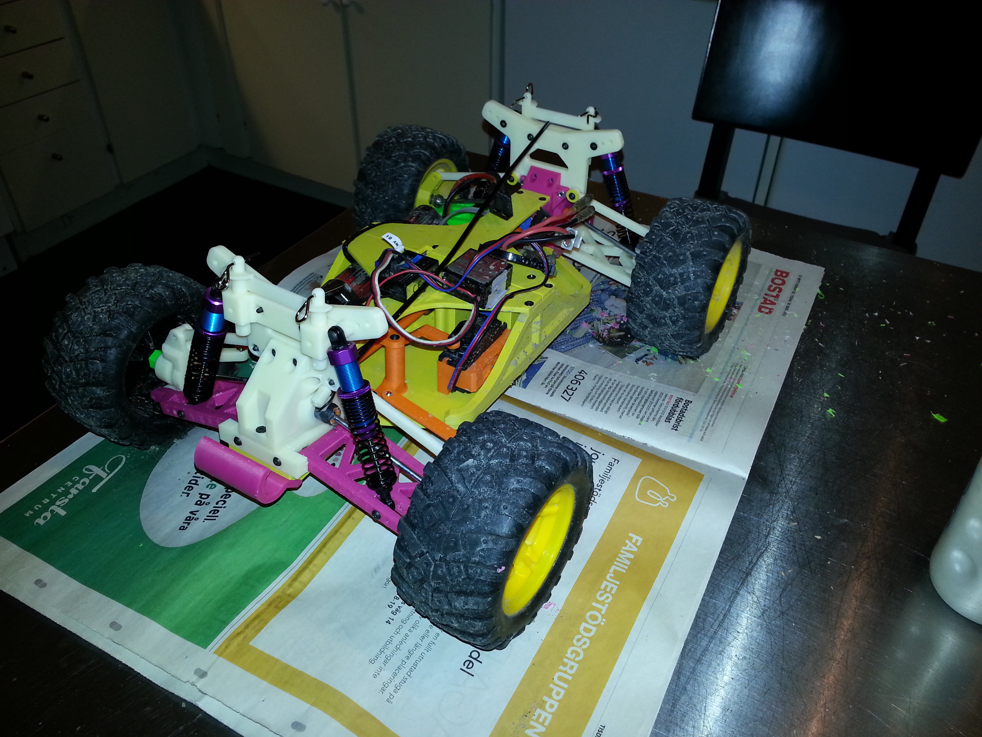 New diff bulkheads front and back, new wishbones, new shocktowers and body holders, new (tiny) bumper. And new shocks… Next up, try to fit a body which slightly bigger than it should be… ;-). Oh, yeah and also testdrive!!!