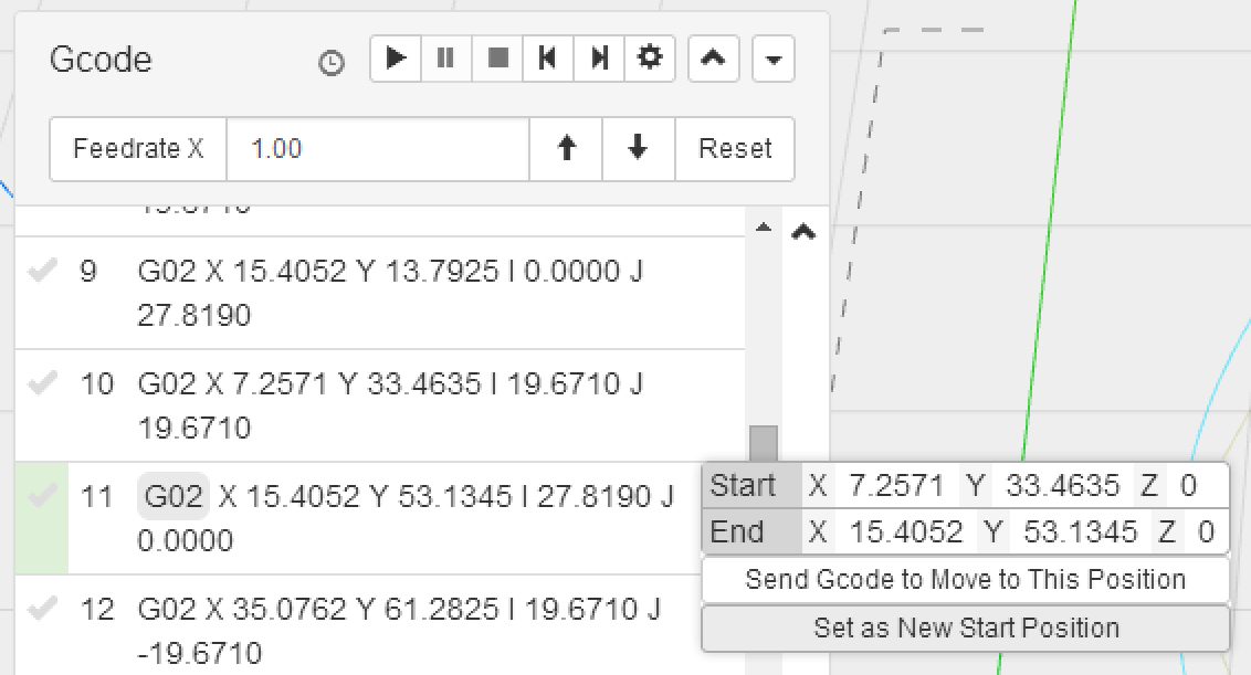 New Flyout menu in Gcode Widget. You can now start your Gcode from any line. Handy if you stopped your job and want to pick it up in the middle of it. Gives absolute start/end position of line in case you want to debug. You can now send the absolute value of the position to your CNC with a single click in case you want to jump to that position.