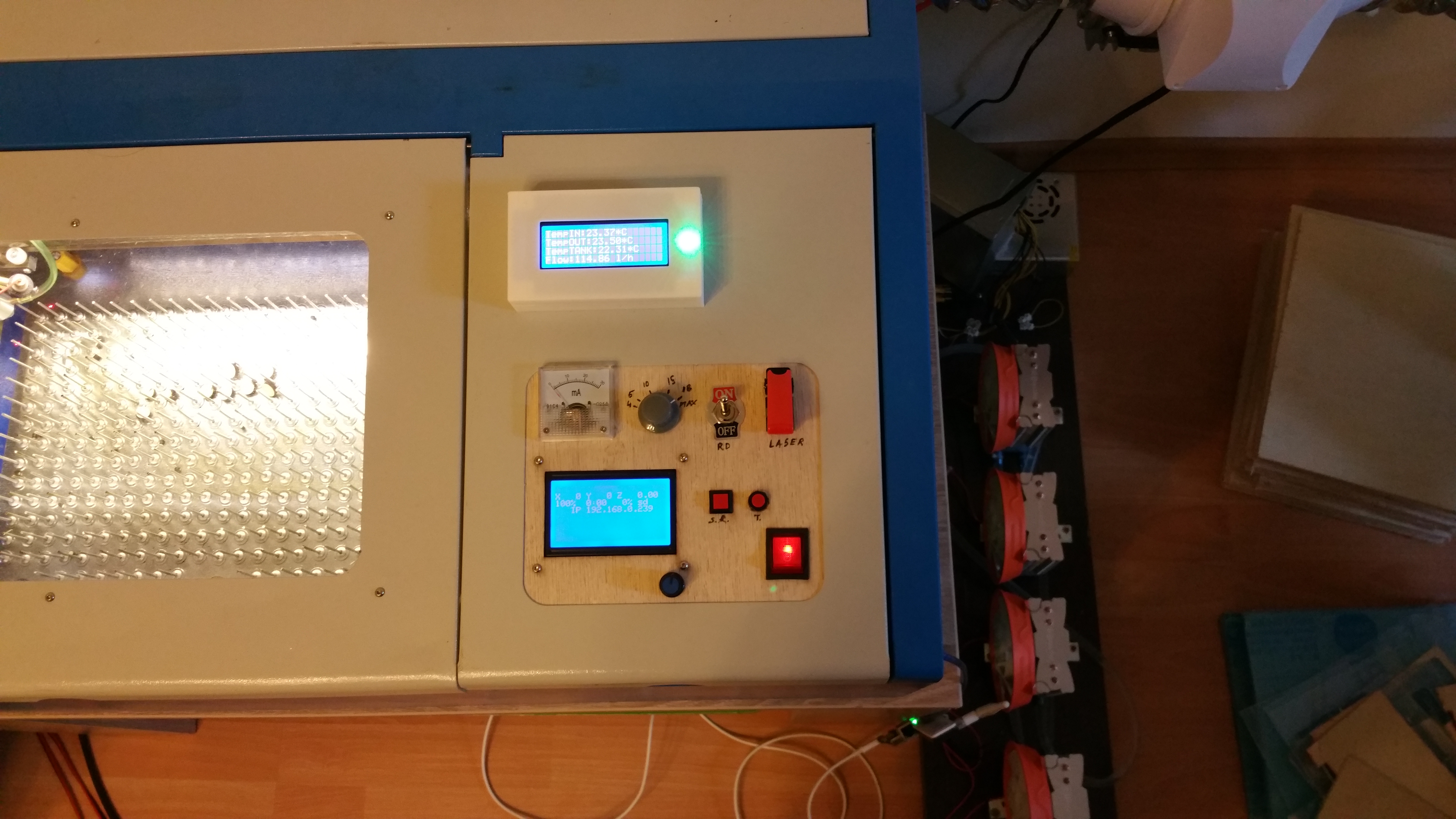 To read the temps I use an arduino and ds18b20 sensors. https://github.com/executivul/LaserSafety To the right are the fan, the air-assist compressor and the chiller.