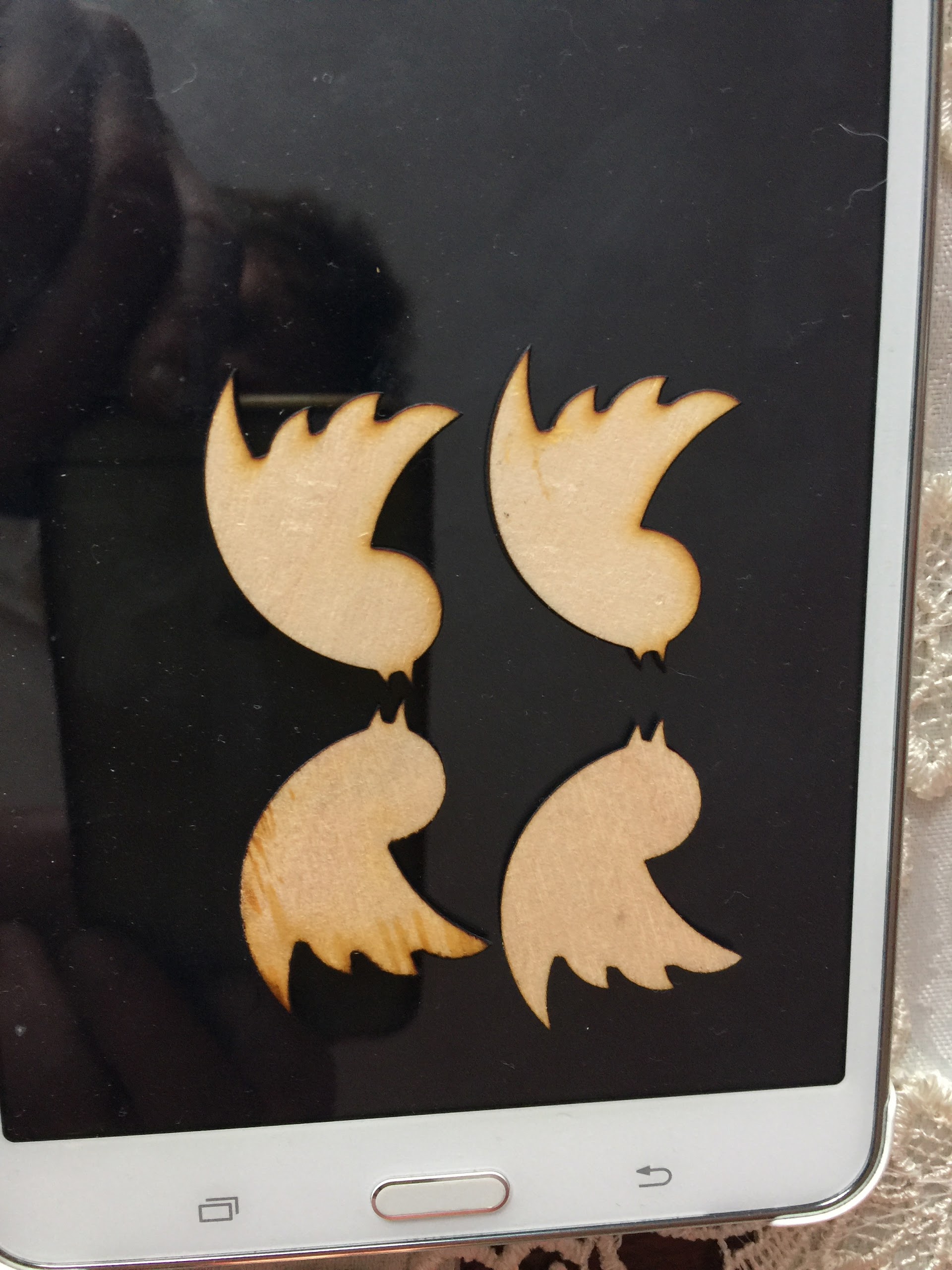 Lots of fume marks on cut items lower left looks good -is this one showing the rear of the cut,with my setup the rear of the cut is noramly cleaner than the top,if you can try increasing air pressure-i am running full size air compressor amd using 10 psi.l to found that the 18mm focal lens heaps better than stock lens size.C an you post some photos of the work peace still in the surounding material ,top and bottom