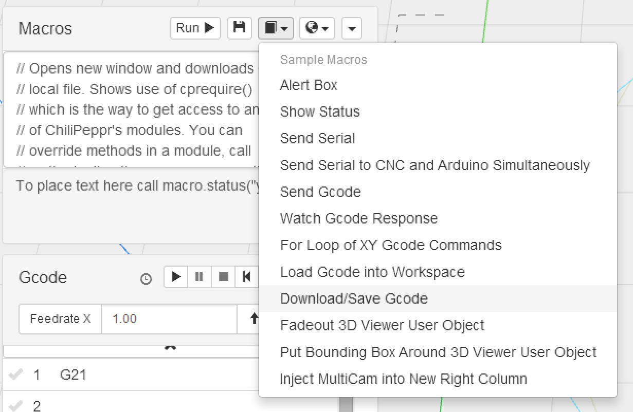 New macro to download your Gcode. In case you modified your Gcode inside ChiliPeppr, which right now only happens via the auto-leveller or a macro, you can download it locally to your computer.