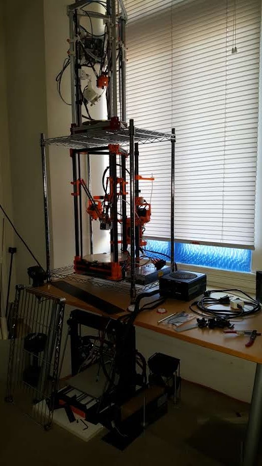 New nesting area for the printers! Much better than spread out everywhere. 3 foot delta will go where the cables and junk are on the right side of the table.