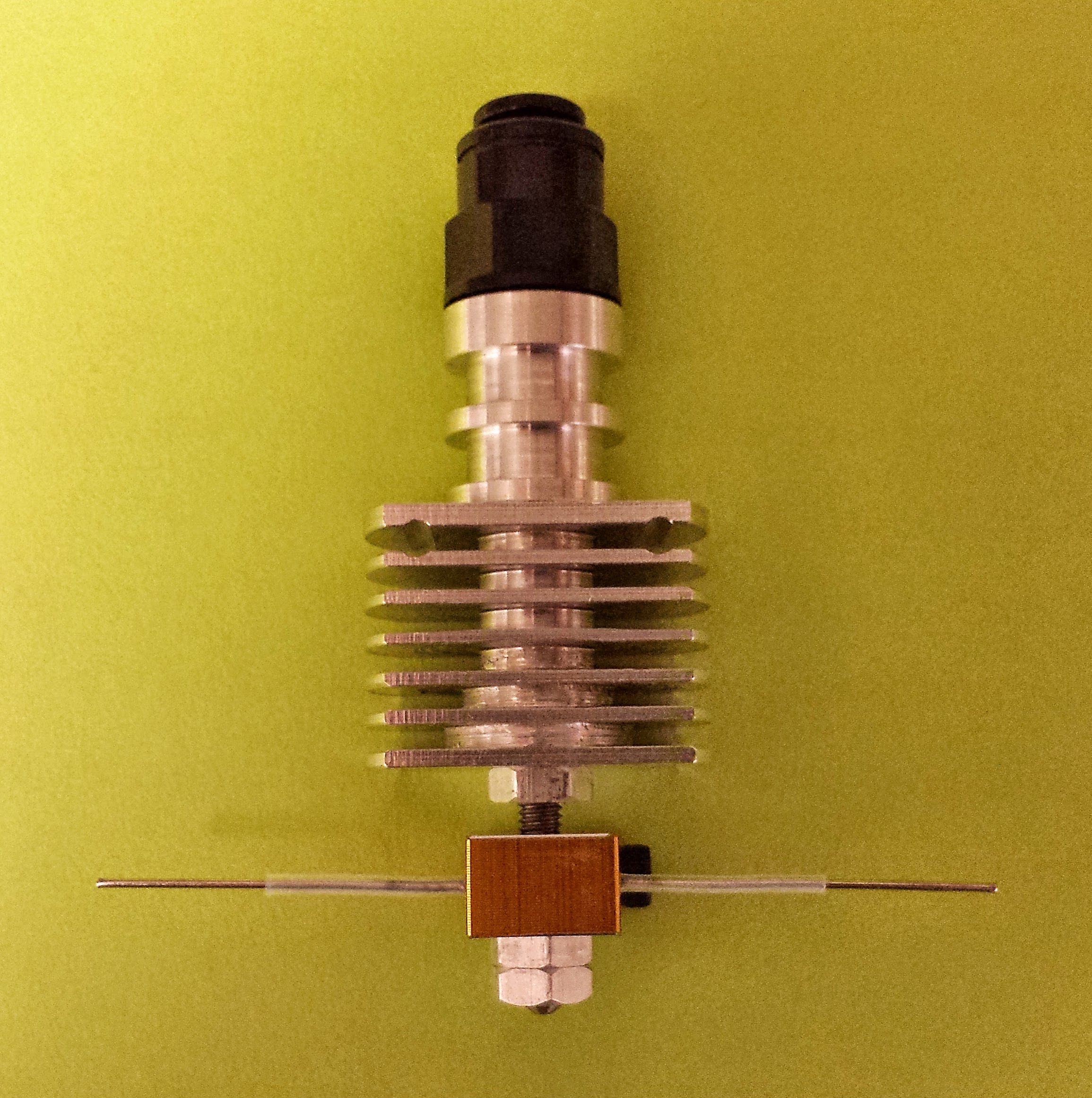 Build in process… I wrapped the heater block in kapton tape and sleeved the resistor leads in teflon tubing to prevent accidental shorts.