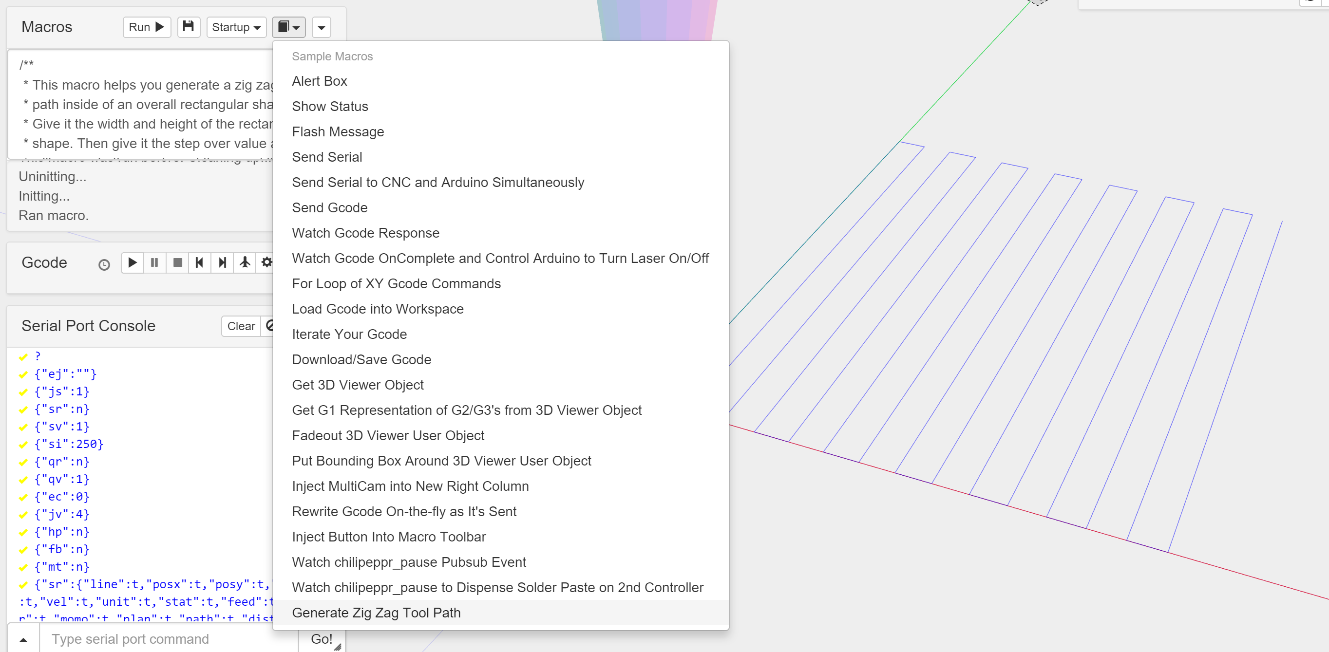 New “Zig Zag” macro. Use it for creating simple pockets or laser scanning regions without ever having to leave ChiliPeppr or use a CAM program. I’ve been using this to ablate solder mask paint on PCB pads/smds. Just enter your width, height, and stepover value and the Gcode is generated automatically.