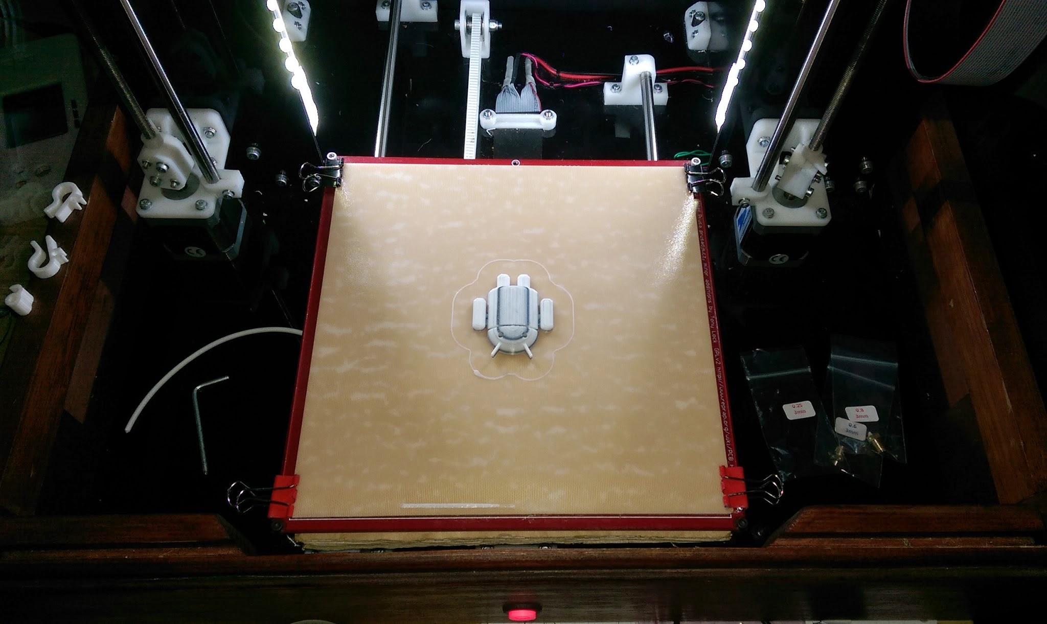 Obviously the first thing I had to do was set my new Z height. Originally I tried putting the PRINTinZ plate directly on my heatbed PCB but I quickly discovered that wasn’t going to work. The flexible plate combined with the flexibility of the heatbed meant my Z height was all over the place, I just couldn’t get it calibrated. So what I did was simply put the glass back on the heatbed as it was before and then put the new plate on the top, problem solved (although I can’t get as much heat through now but it turns out I don’t need it anyway).