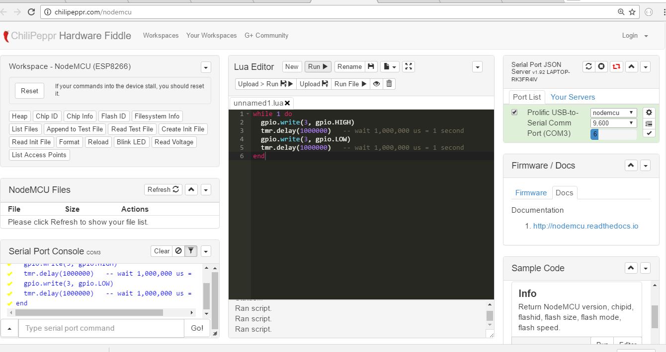 Node MCU workspace. I got the console cable and had no problem connecting and running basic blink but the same thing in John’s Chilipeppr nodemcu workspace I get nothing back and what looks like a stalled buffer trying to run the same program. I know this is new stuff so I’ve most likely missed something obvious. It was trivial to use the console cable and type the code. Much easier than arduino and pi stuff. These esp8266 guys a very cool.