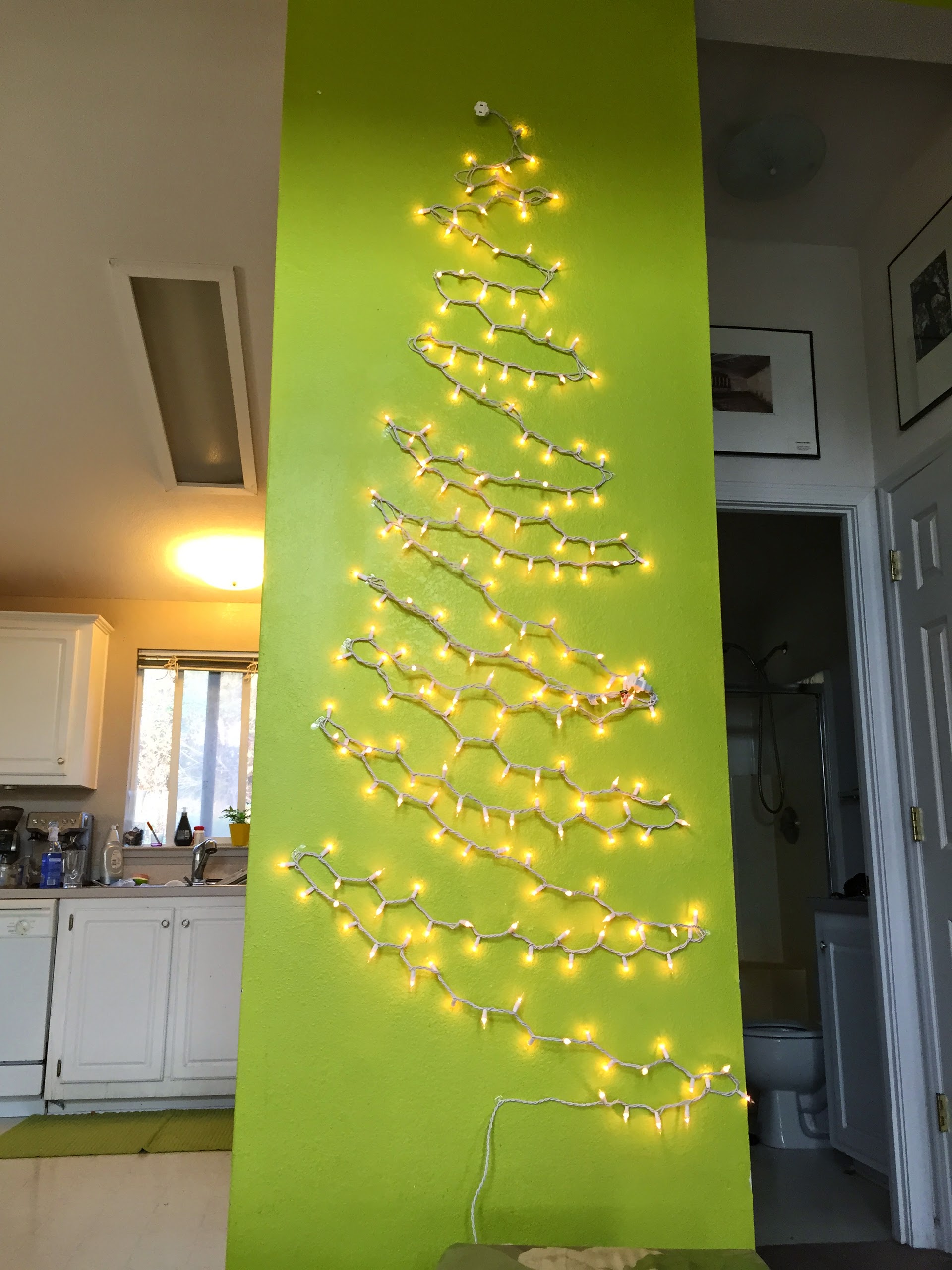 Not LED’s but, next year, it could be! This was my wife’s idea for a non traditional christmas tree. At the moment it’s two strands of white incandescent (ewwww, I know) christmas lights secured to the wall at each corner point.