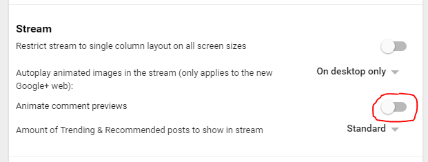 Off Topic, Google+ setting you might now know about. I was writing feedback to Google about this when I realized you can turn of one of the things I find very annoying about Google+ communities. It is the fact that under each post, they animate/scroll through comments if the comment section is not expanded. I just find this annoying as it draws my eye away from what I am reading. To turn it off, go to settings: