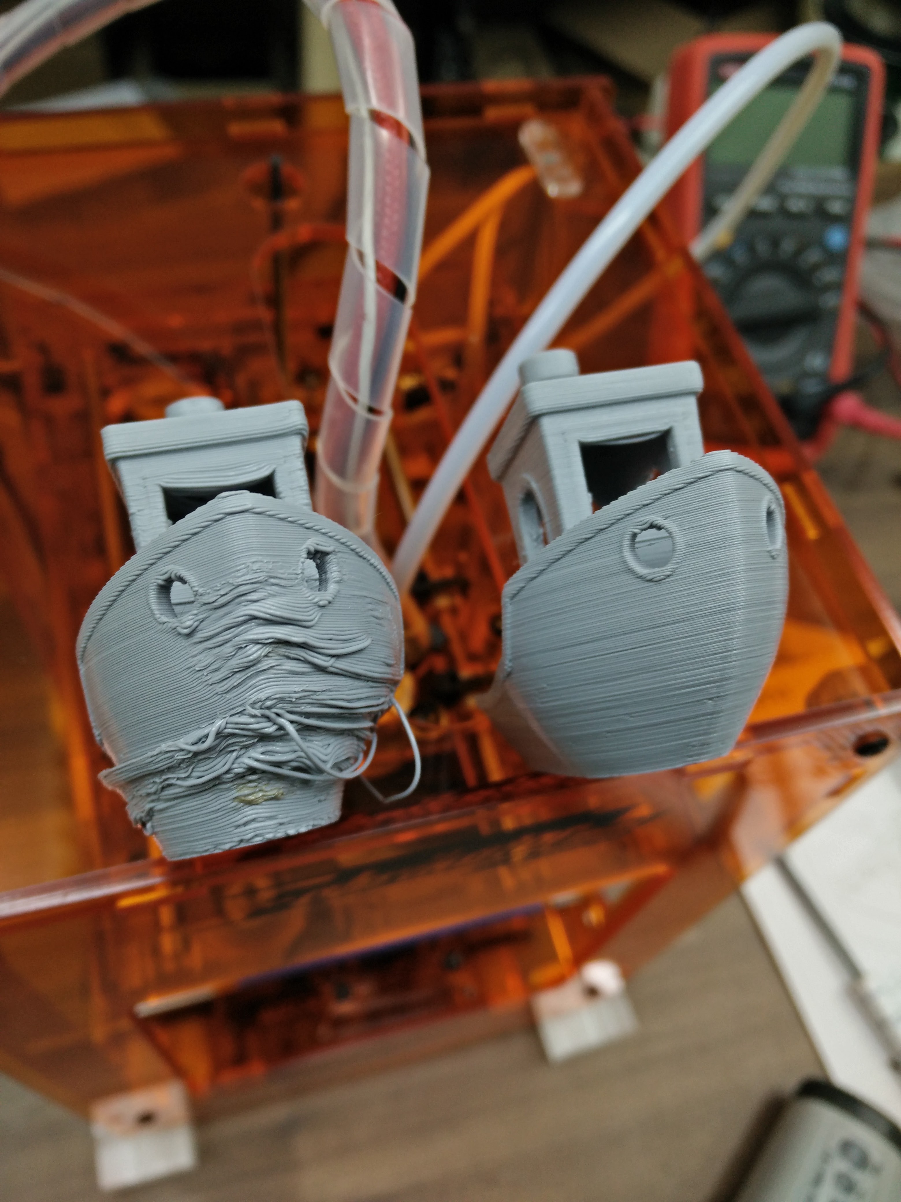 Oh the difference a single fan makes! Both prints were done on the @HobbyKing Fabrikator Mini with the same gcode, but the right one had a 120mm fan blowing over the entire printer. The Fabrikator Mini does not have a part cooling fan, so this little detail makes a world of a difference!