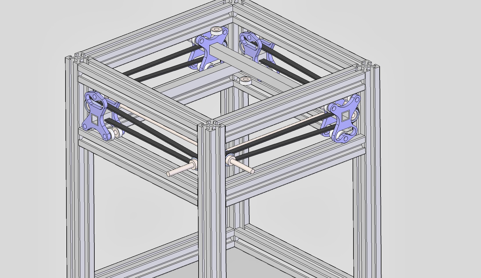 OK, here’s the idea I got based on the work @Shauki has been doing on his Quadrap. There’s still a ton of work to be done here, but I’ve at least worked out that it all fits together without interference. Clearance is a little tight. There’s 2 mm between the beams and 0.5 mm between the Ø5 mm shafts.