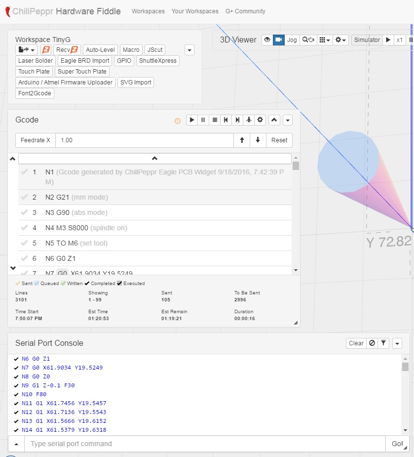 Ok, I’m really confused now. Eagle BRD import turns my CNC into a tool murderer. I load ChiliPeppr. I open Eagle BRD import. I drag in my brd file. Set inflate, spindle speed, etc, render, Gcode. When I hit the Play button on the Gcode, nothing happens, not even M6 dialog popup. I click pause, nothing. I click pause again, the CNC starts running but without turning on the spindle!!! I darn near snapped off my brand new $20 PCB endmill. Fortunately I hit stop real fast and it scraped a tiny scratch into the PCB with the stationary tool without snapping it. Below you see the Gcode has an M3 and an M6. But in the serial console, you see it just started on Line 6 with G0 Z1, it skipped over M3 and M6. So far this only seems to happen with Eagle BRD import because I ran another file I had and also the default logo file and they work fine.