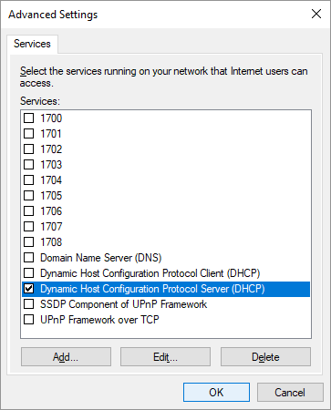 - In Win10, that is not enough, unfortunately. You must explicitly tell the “share” which services to share. Of course, the only one Ares cares about is DHCP server. (Not sure why DHCP client is even listed as a service! But do not select that one.)