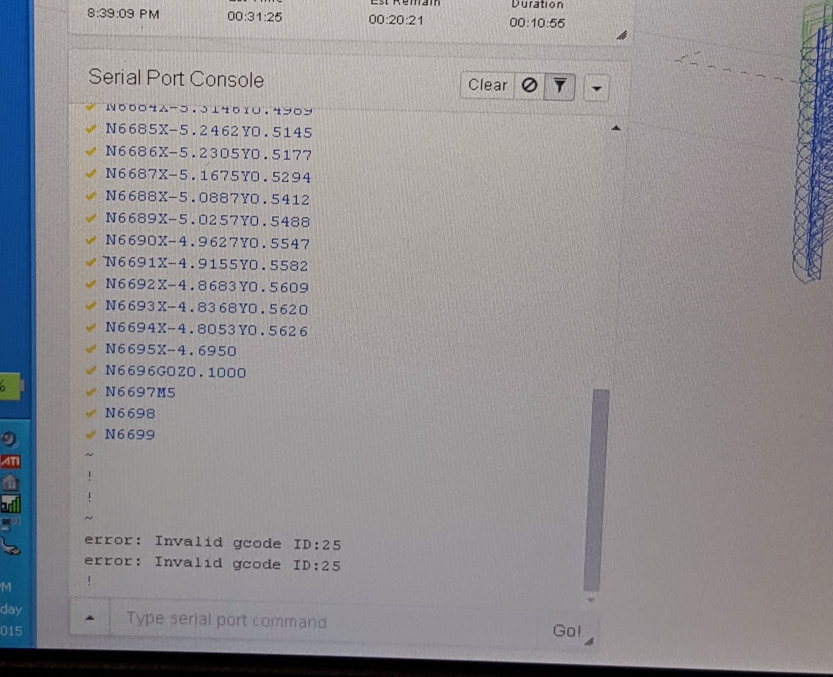 On nearly every job, I see errors returned from the Inventables gShield running GRBL 0.9. Error codes 25 and 33 seem to be the common ones. Often clicking up-pause in Chillipepper is required to get the job to continue. Today the XCarve cutter gouged my part badly after one of these errors. So I guess I need to get to the bottom of it. I use MeshCAM to generate the GCode. My files are typically 3-10k lines. And I am running SPJS 1.86 with Chillipepper.