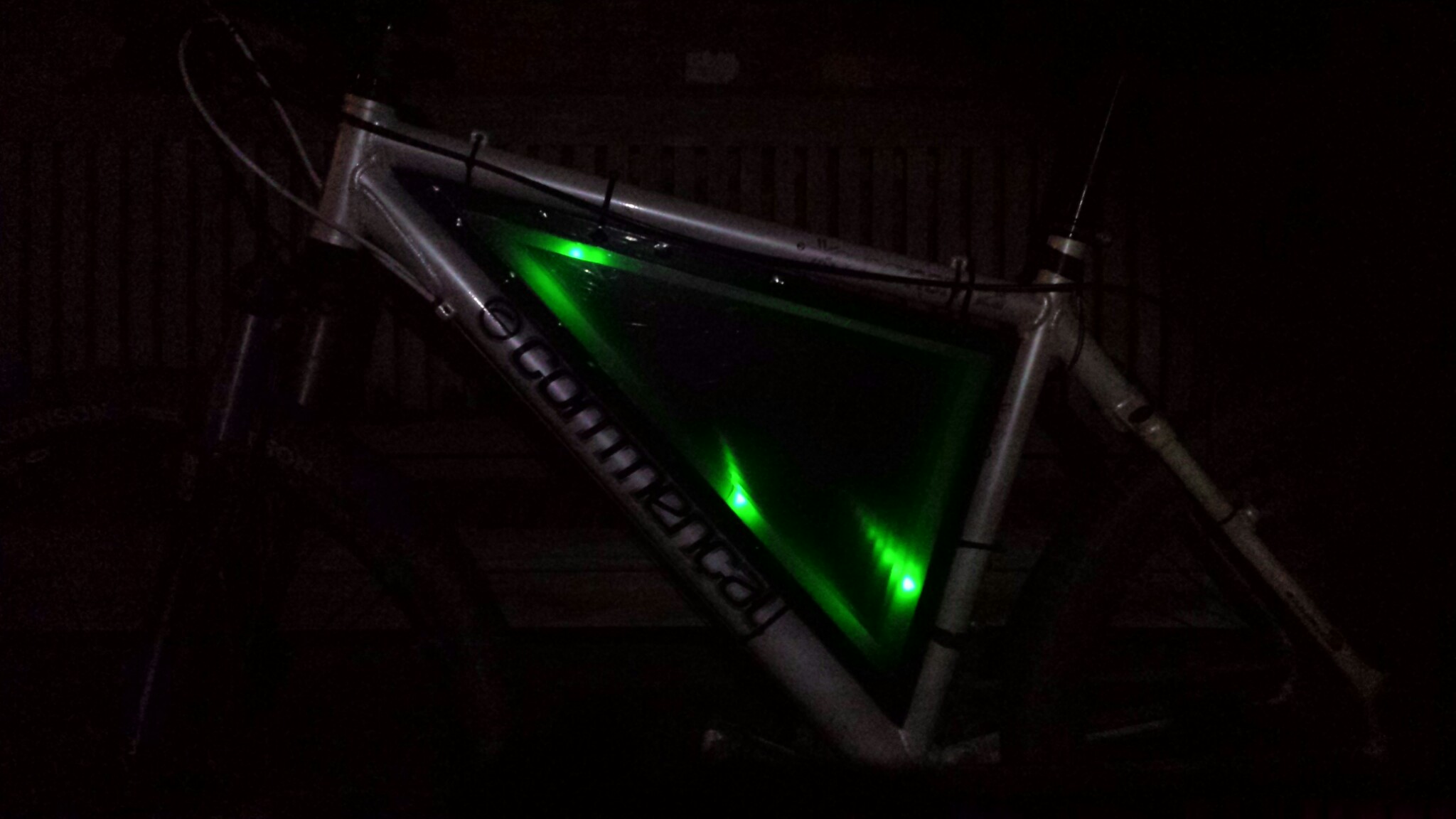 A doublesided inifinity mirror mounted in the frame of the mountainbike, 72 ws2812b powered by nano and 14v batterypack. Pixels defused with drawing paper. Currently running the good old funboxing effects.