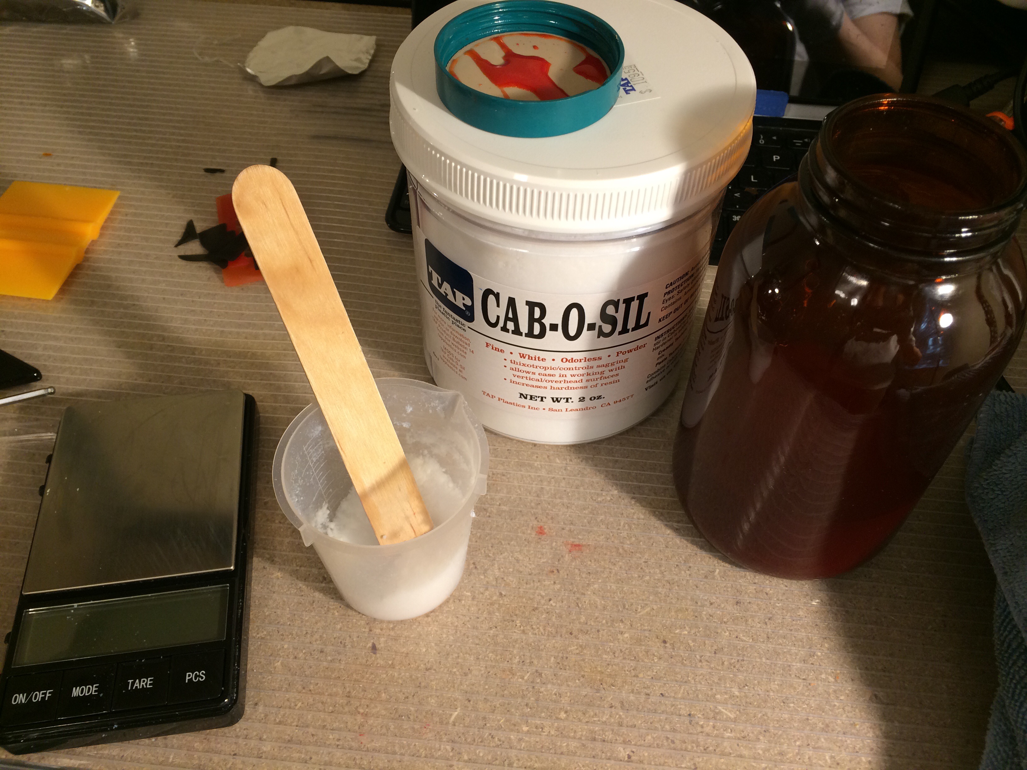 The FunToDo Standard Blend resin is fairly soft (Shore D 30) and presented a better medium for experimentation with strengthening and hardening fillers than the MakerJuice G+ (which is very hard and I would have to test more around changes to its impact resistance given that I have no testing tools). I added 5% (by weight) of milled glass to try to increase strength and then 1% (by weight) of cabosil to make the resin more thixotropic to reduce settling since the milled glass is fairly heavy.