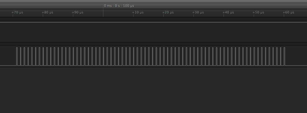 What Dan is (correctly!) bragging about here is that he’s now optimized the FastLED ‘data transmission’ code so perfectly that there’s literally, numerically, exactly ZERO pause between pixels. FastLED is now sending the pixel data to the LED strip as fast as physically possible, while still having the LEDs operate correctly. We’ve now hit the ‘speed of light’ for Neopixels. If you look at the scope trace picture above that Dan posted, you’ll see just uniform pulses – no ‘slight gaps’ between pixel groups at all.