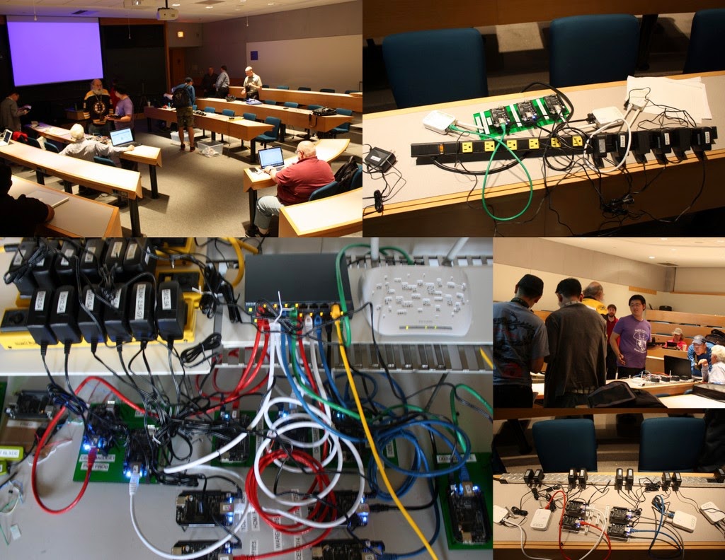 Prior to the meeting, we built an 11-beagle net with ethernet, DHCP/AP and switches. Our classroom deployment was a wireless mesh. The BeagleBones ran Wheezy and Jessie. Each Beagle ran a web server (in Dart) that auto-booted. Each Beagle ran a “unique” Dart web app to distinguish one node-url from another. The intent was a simple simulation of a “physical web” or “IoT infrastructure”.